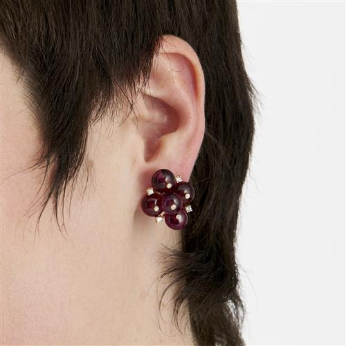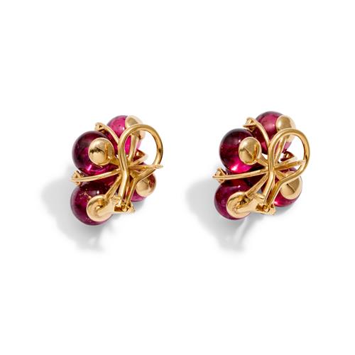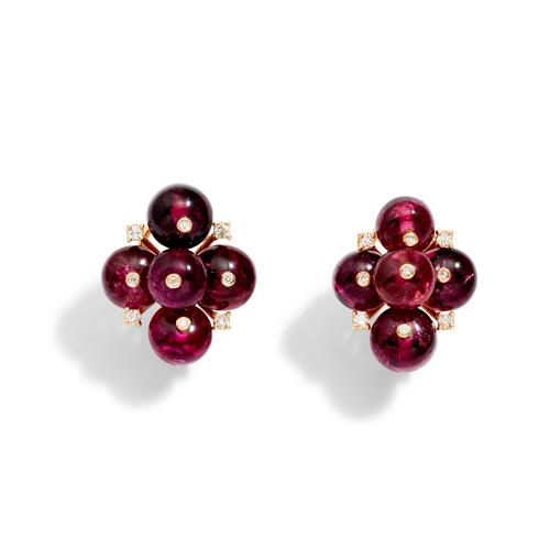 Each designed as a cluster of spherical pink tourmaline beads measuring 7.50 to 8.5mm, surmounted by a collet-set brilliant cut diamond between claw-set diamond accents, the diamonds together weighing approximately 0.34 carats, mounted in 18ct gold, length 22.5mm, 18.5mm, post and omega clip fittings.