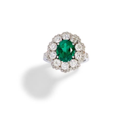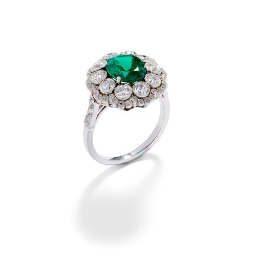 Of cluster design, centring a claw-set oval Colombian emerald weighing approximately 2.20 carats, framed by a double halo of millégrain-set circular-cut diamonds to similarly set shoulders, the small diamonds together weighing approximately 2.07 carats, mounted in platinum, size L.