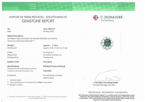 Accompanied by a C. Dunaigre report numbered CDC 2205257, dated 9 May 2022, stating that the approximately 2.20 carat vivid green emerald is natural, with no indications of clarity enhancement, of Colombia origin.