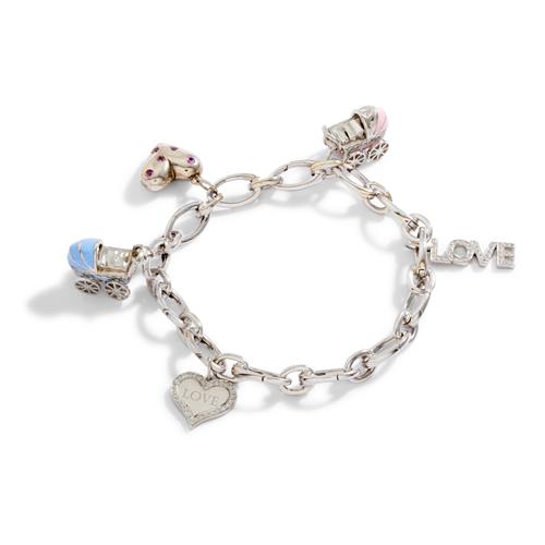 Composed of a line of oval links supporting five detachable Tiffany theme charms including a pavé diamond set LOVE logotype in platinum, a pink tourmaline set puffed 'Heart' in sterling silver, a pavé-set diamond and blue enamel 'Pram' in platinum, a pavé-set diamond and pink enamel 'Pram' in platinum, a pavé-set diamond 'Love' heart in platinum, length 175mm, bracelet signed T & Co for Tiffany & Co., the charms signed T & Co for Tiffany & Co.