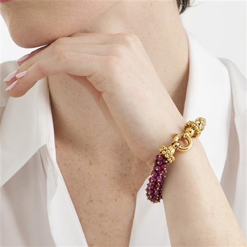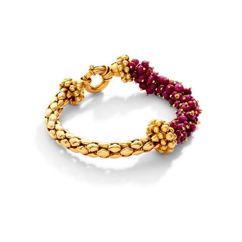 Of split design, composed of a cluster of spherical ruby beads with gold terminals completed by openwork spherical chain composed of half round brick-links to openwork bolt clasp, inner circumference 185mm, Italian marks.