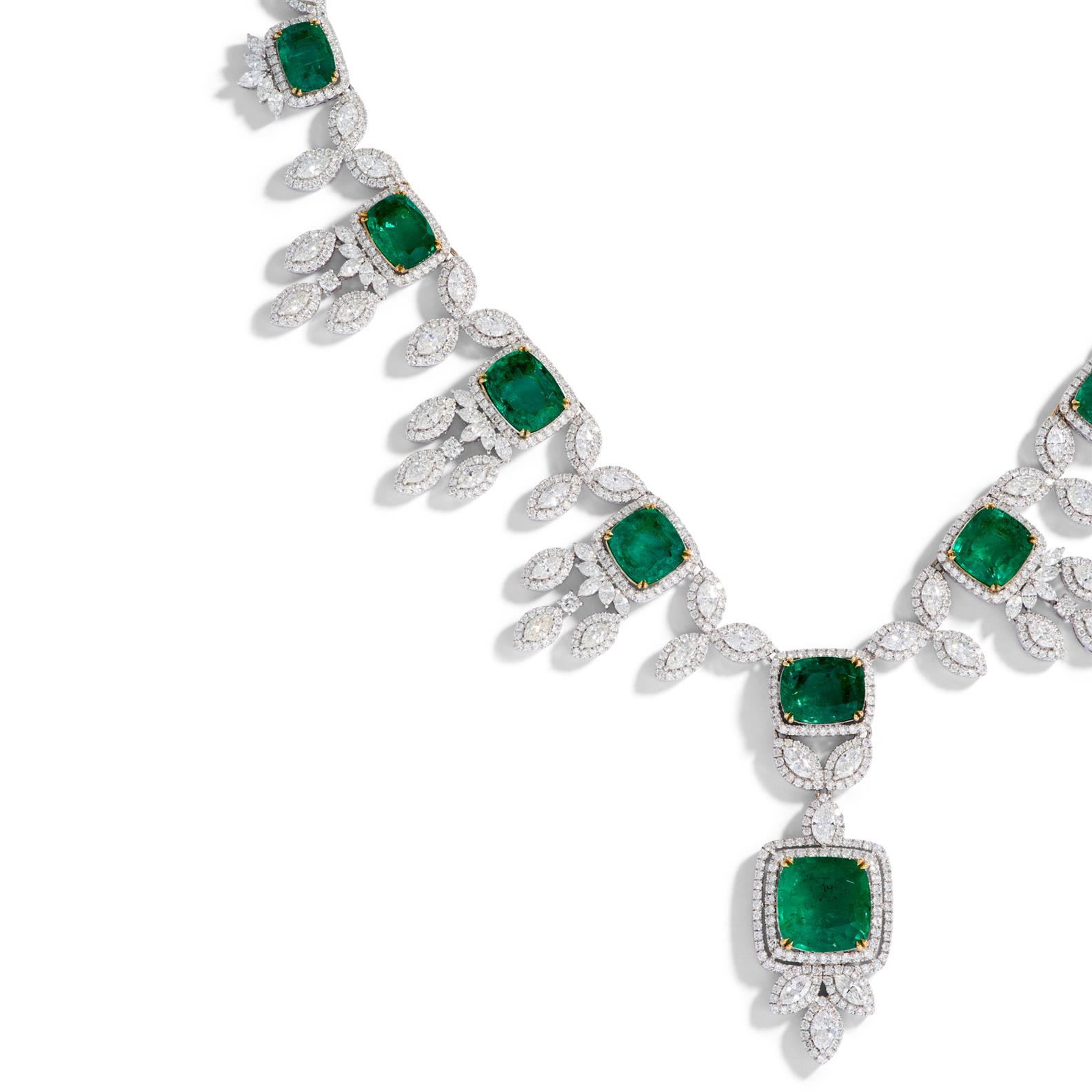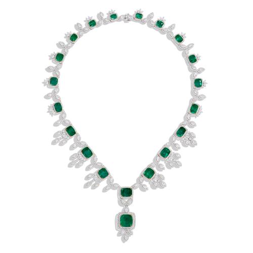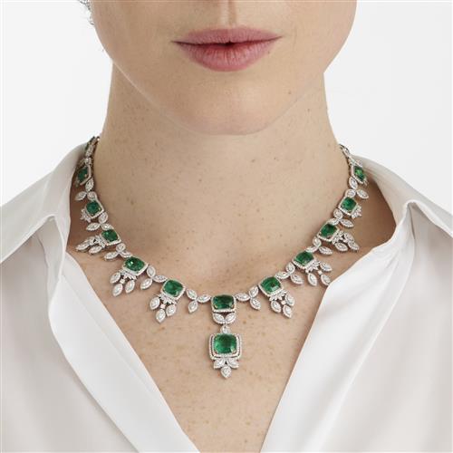 Composed of a line of cushion shaped emeralds encircled by a halo of circular-cut diamonds alternating between a foliate motif embellished with marquise and brilliant-cut diamonds, the front further decorated with diamond clusters terminating on a similarly set emerald and diamond swing drop, the twenty emeralds and diamonds together weighing approximately 30.69 carats and 17.78 carats respectively mounted in 18ct white gold, inner circumference 430, length 434mm.