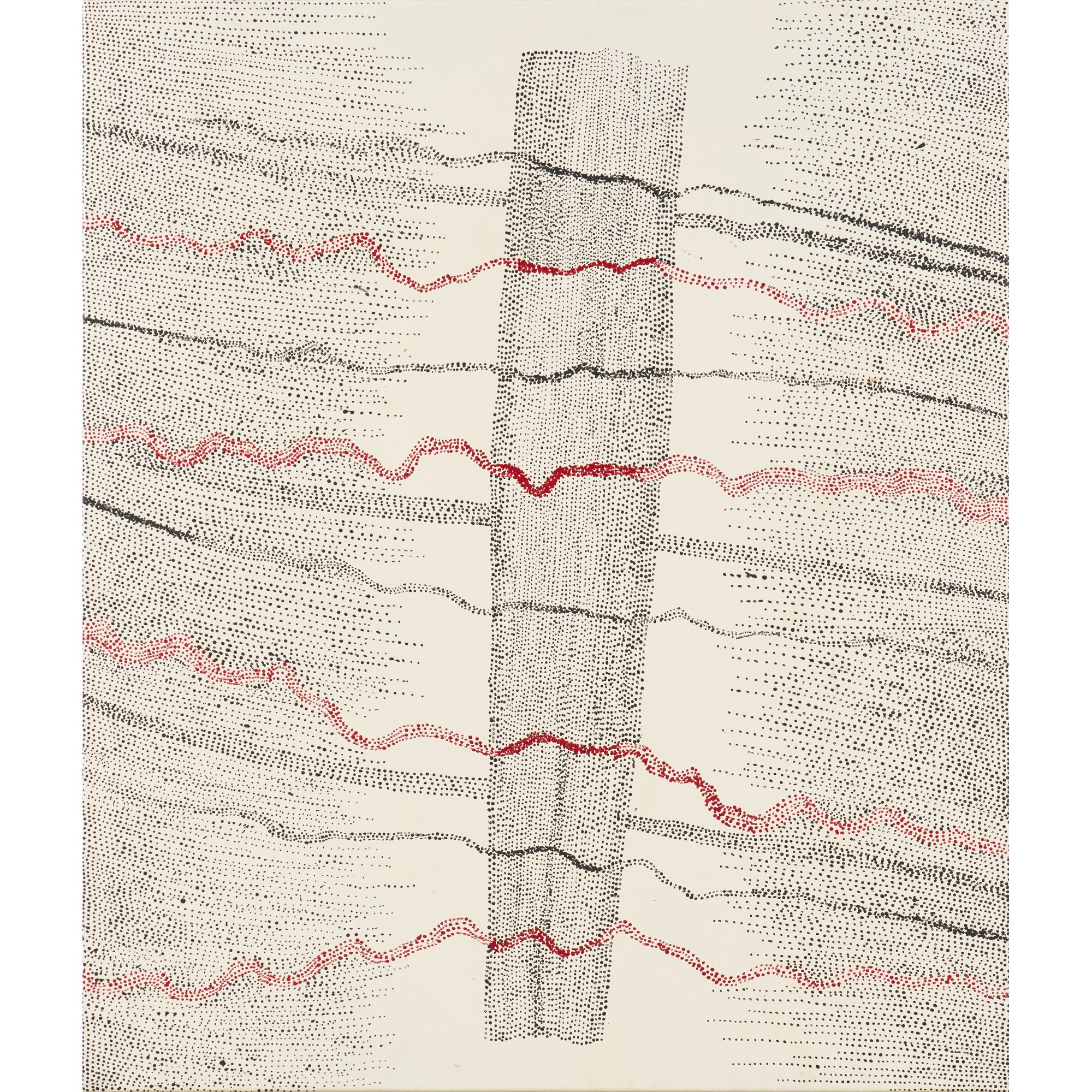 The 'kirda' (owners) of this country are Napangardi/Napanangka women and Japangardi/Japanangka men, who can depict portions of the Mlna Mina Jukurrpa In their paintings. The artists mother, Dorothy Napangardi (1956-2013) painted Mina Mina and has passed down her Jukurrpa stories to her children and asked them to continue to paint for her. There are a number of different components of the Mina Mlna Jukurrpa; artists usually choose to depict one particular aspect. These can include 'karnta' (women), 'karlangu' (digging sticks), 'majardi' (hairstring skirts/tassels), 'ngalyipi' (snakevlne [Tinospora smilacina]), 'jlntiparnta' (desert (ruffle [Elderia arenivaga]), and 'kurrkara' (desert oak [Allocasuarina decaisneana]).