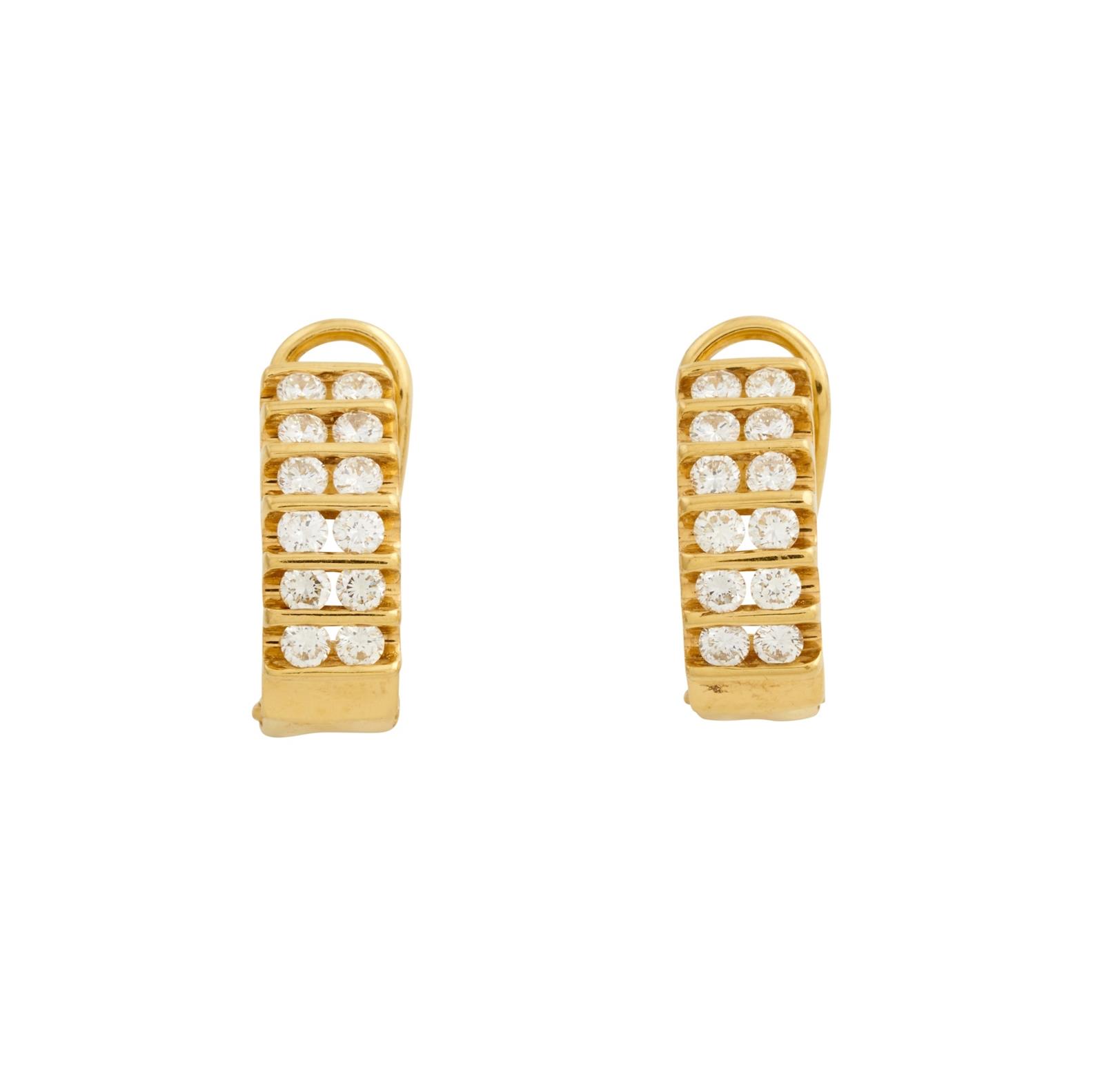 Of half-hoop design, each set with two lines of channel-set brilliant-cut diamonds together weighing approximately 0.48 carats, mounted in 18ct gold, post and clip fittings, length 12mm, gross weight approximately 4.5 grams.