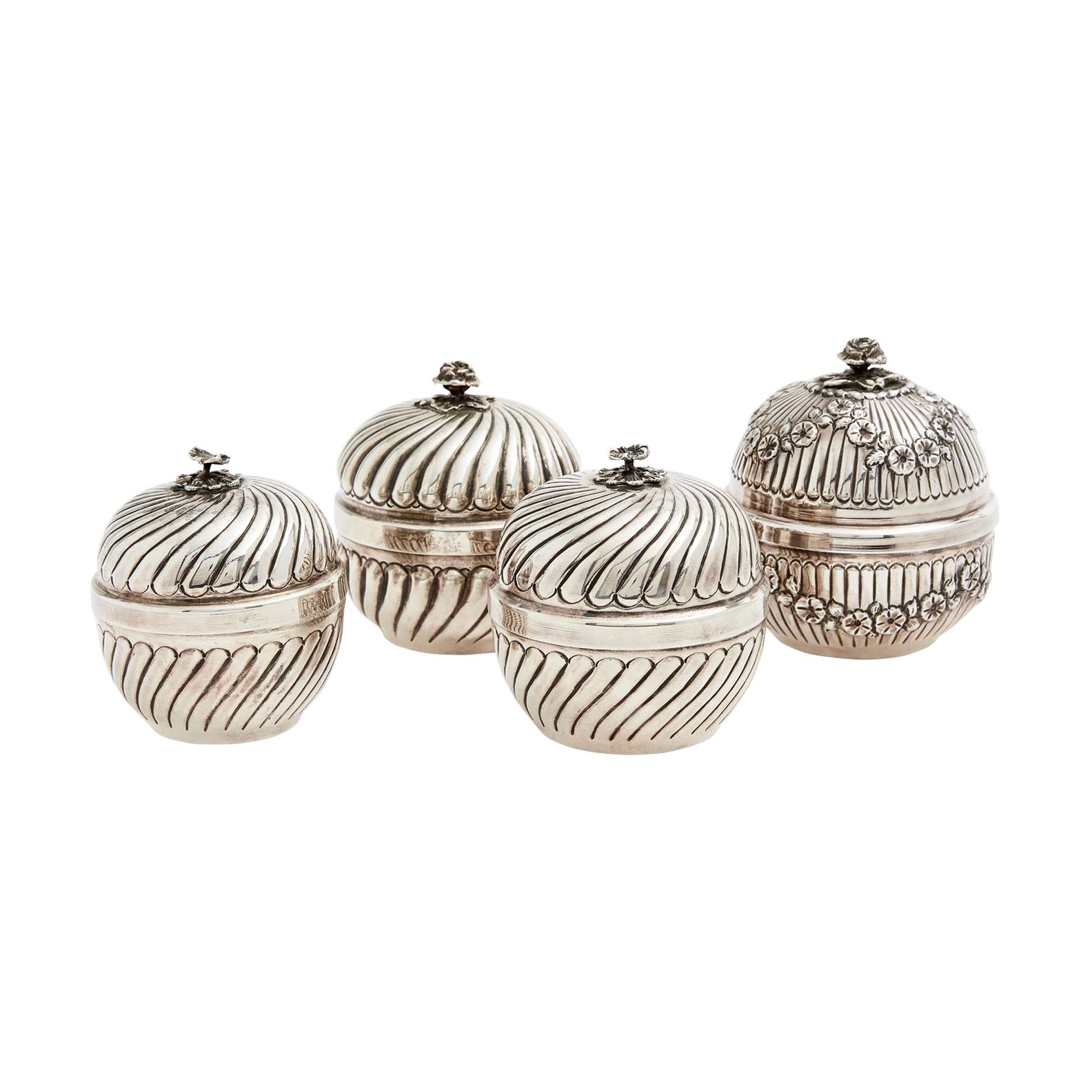 These boxes are all in good condition with acceptable tarnishing and wear, minor dents and scratches consistent with age and use. They have gilt interiors so my thought was they were for soap, sponges or powder on the dressing table.