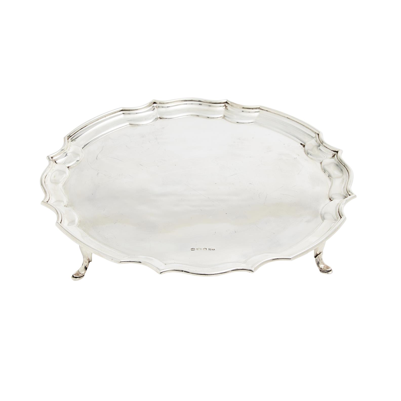 Maker's mark of F Drury Ltd, Sheffield 1961, circular with pie crust border on four pad feet.