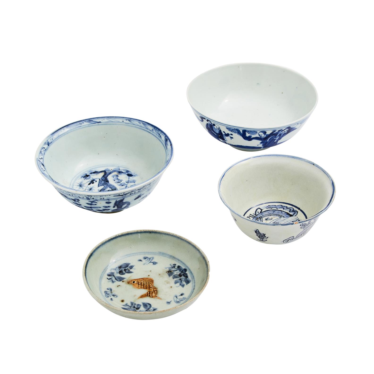 Comprising a Ming bowl painted with 'the three friends'; a Ming shallow bowl decorated with a fish; a 19th century bowl with figures in a garden; and another with stylised Chilong.