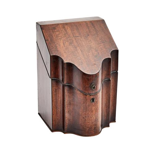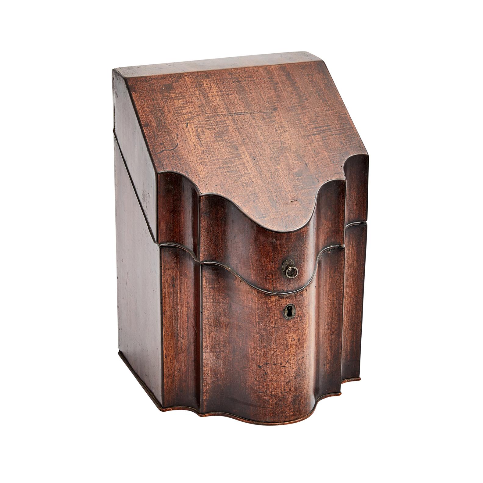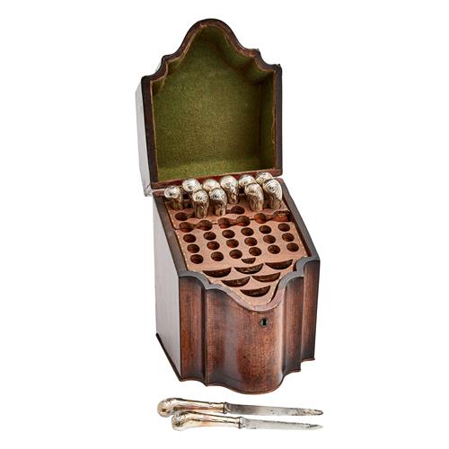 The box with hinged cover and shaped front, the knives with foliate scroll terminals and variations to blades.