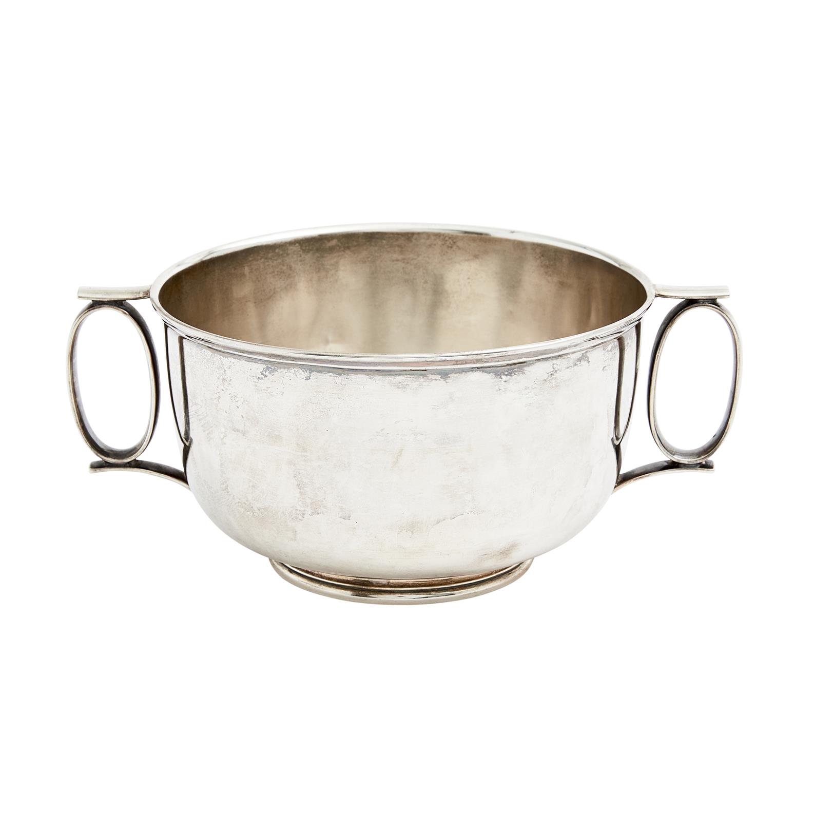 Maker's mark of Hardy Bros., London 1912, the plain bowl flanked by a pair of oval loop handles on a moulded foot.