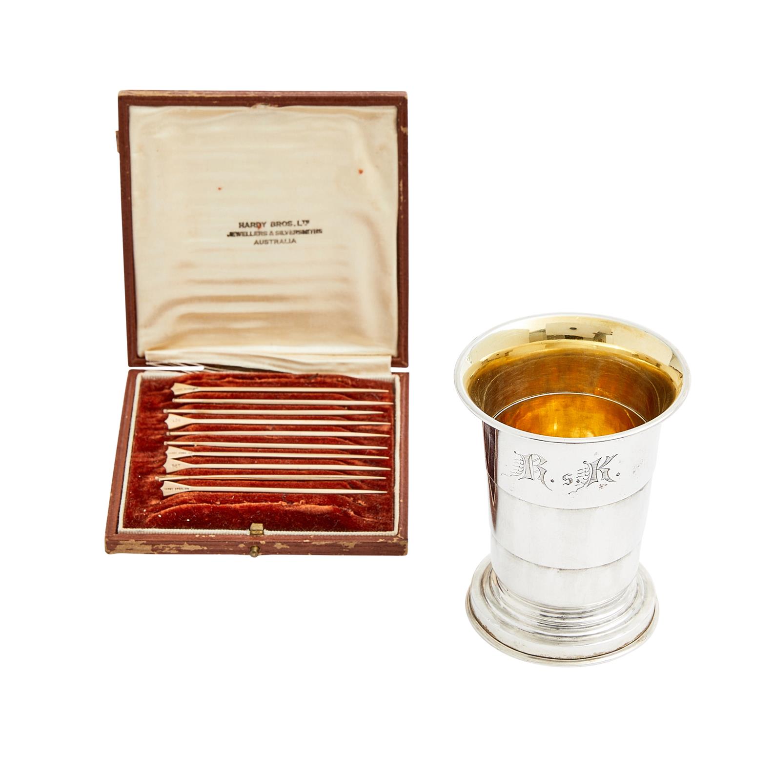 The cocktail picks with maker's mark of Hardy Bros. Ltd, stamped 9ct, in original fitted case; the collapsible cup with gilt interior in fitted case.