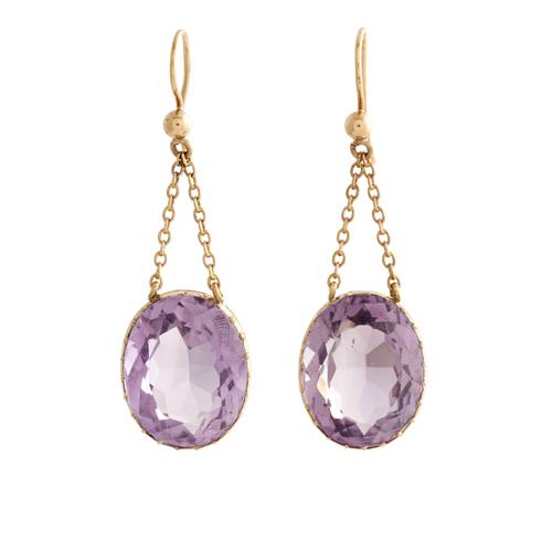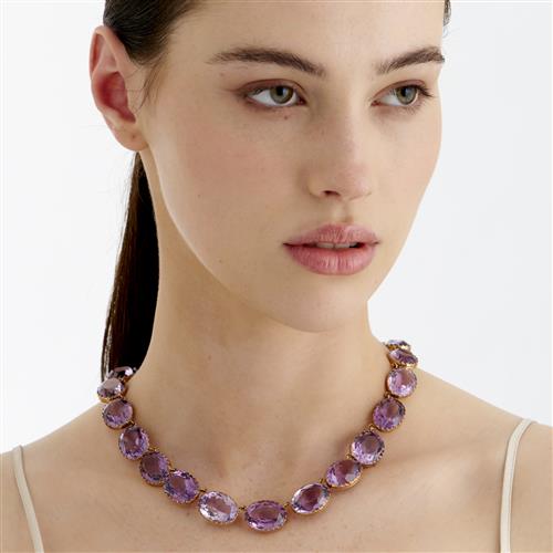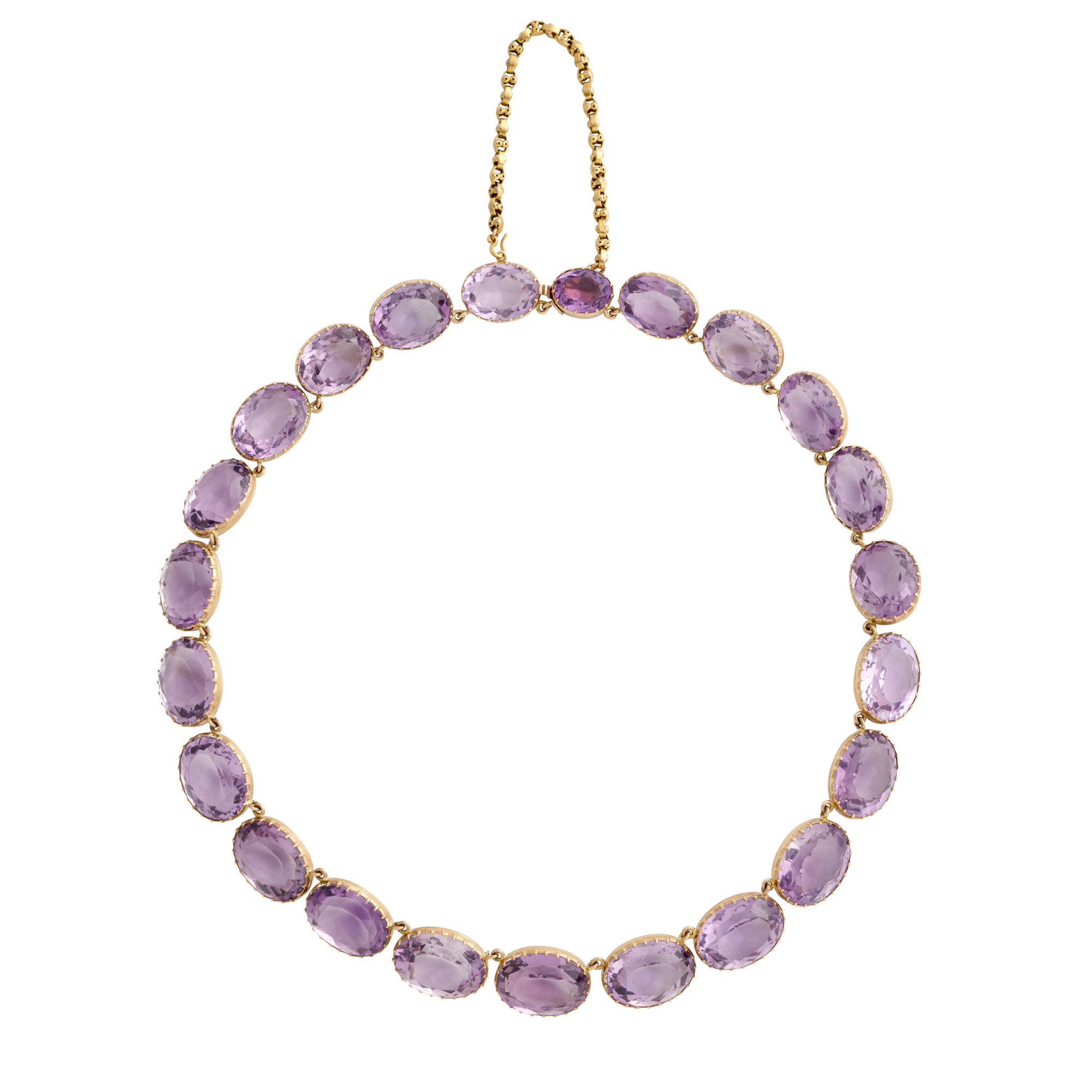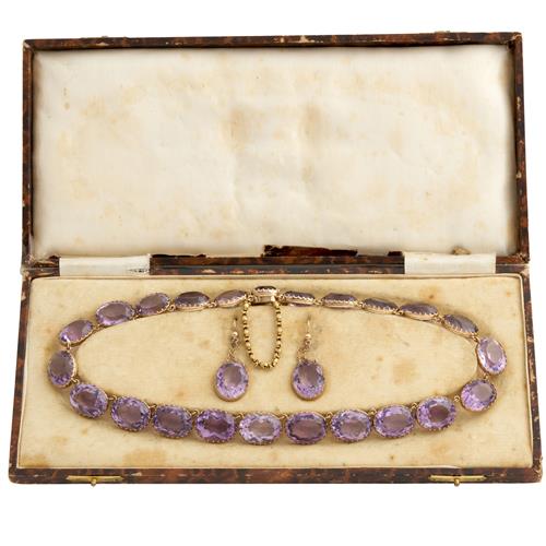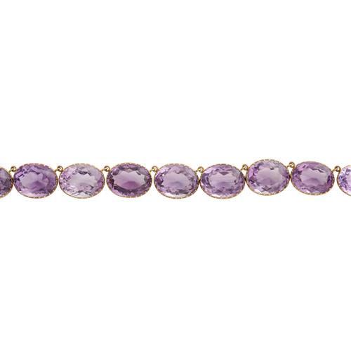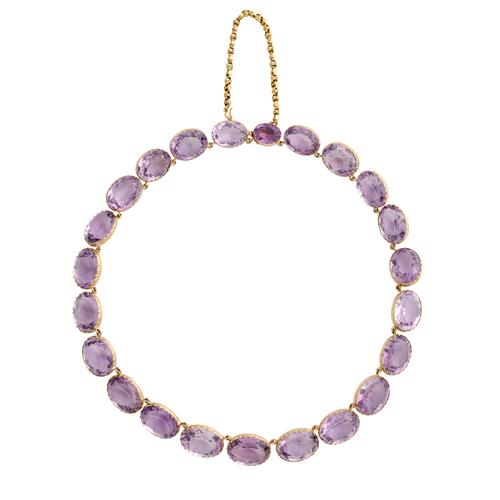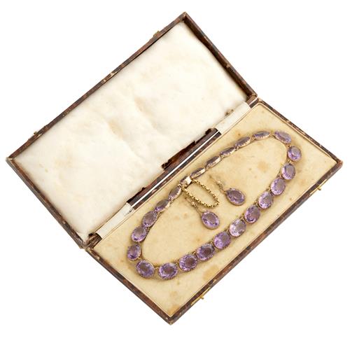 Comprising a riviere necklace composed of twenty-five oval faceted amethysts, completed by a concealed box clasp, with a safety s-hook clasp in 15ct gold; together with a pair of earrings with similarly set amethysts below a chain drop, to shepherd hook fittings, the amethysts together weighing approximately 301.0 carats, necklace length 450mm, earring length 51mm, gross weight approximately 101.2 grams.