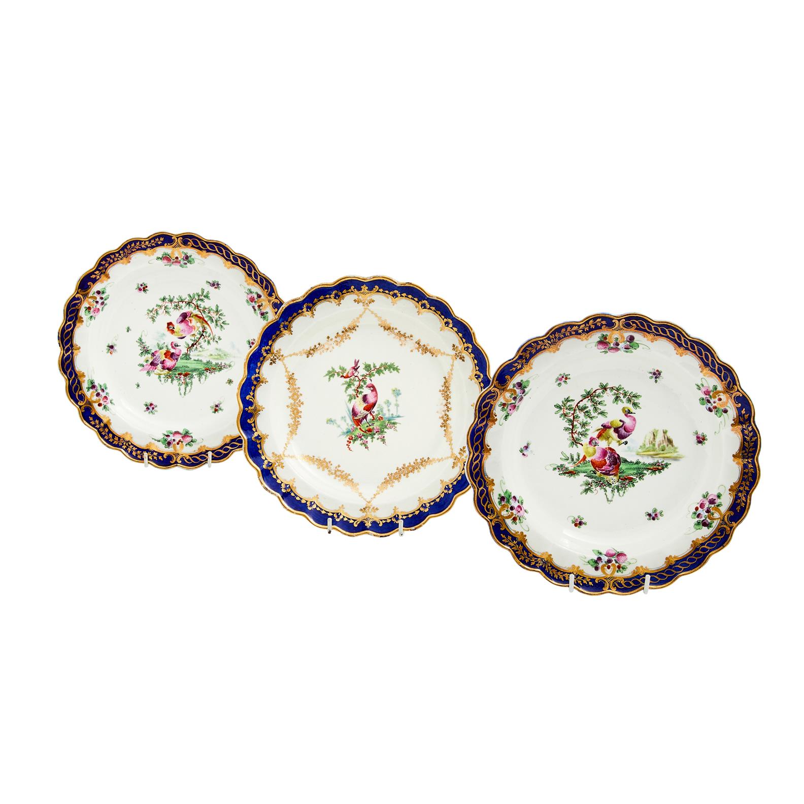 Each with exotic waterfowl and insects within a blue and gilt border, the single plate decorated with gilt flower swags.