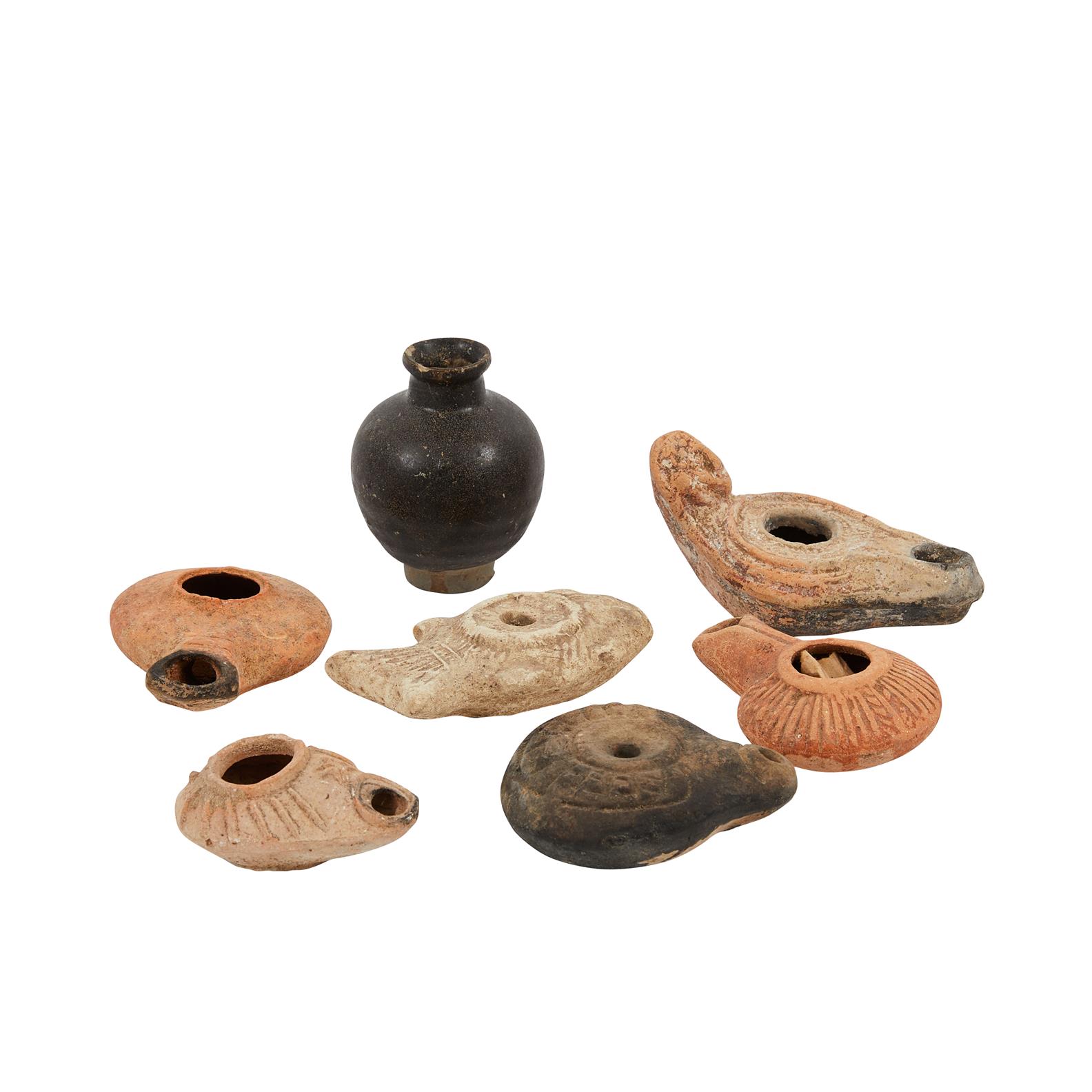 A COLLECTION OF SIX ANCIENT TERRACOTTA OIL LAMPS AND A STONEWARE JARLET