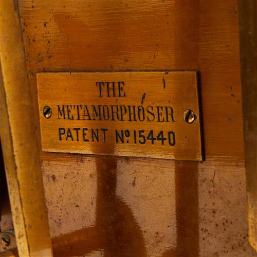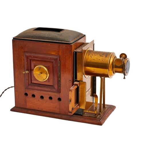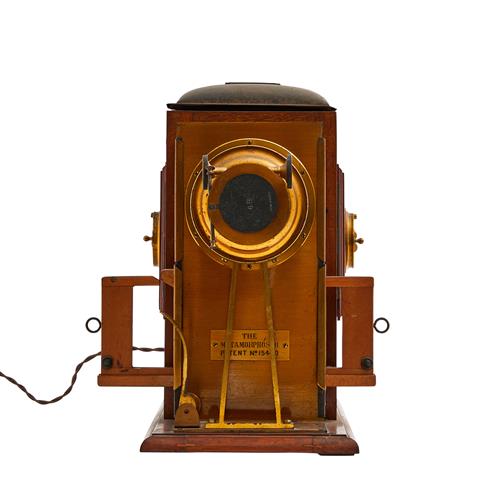 Late 19th century, mahogany case with brass lens and tole cover, with titled engraved plaque and patent number 15440.