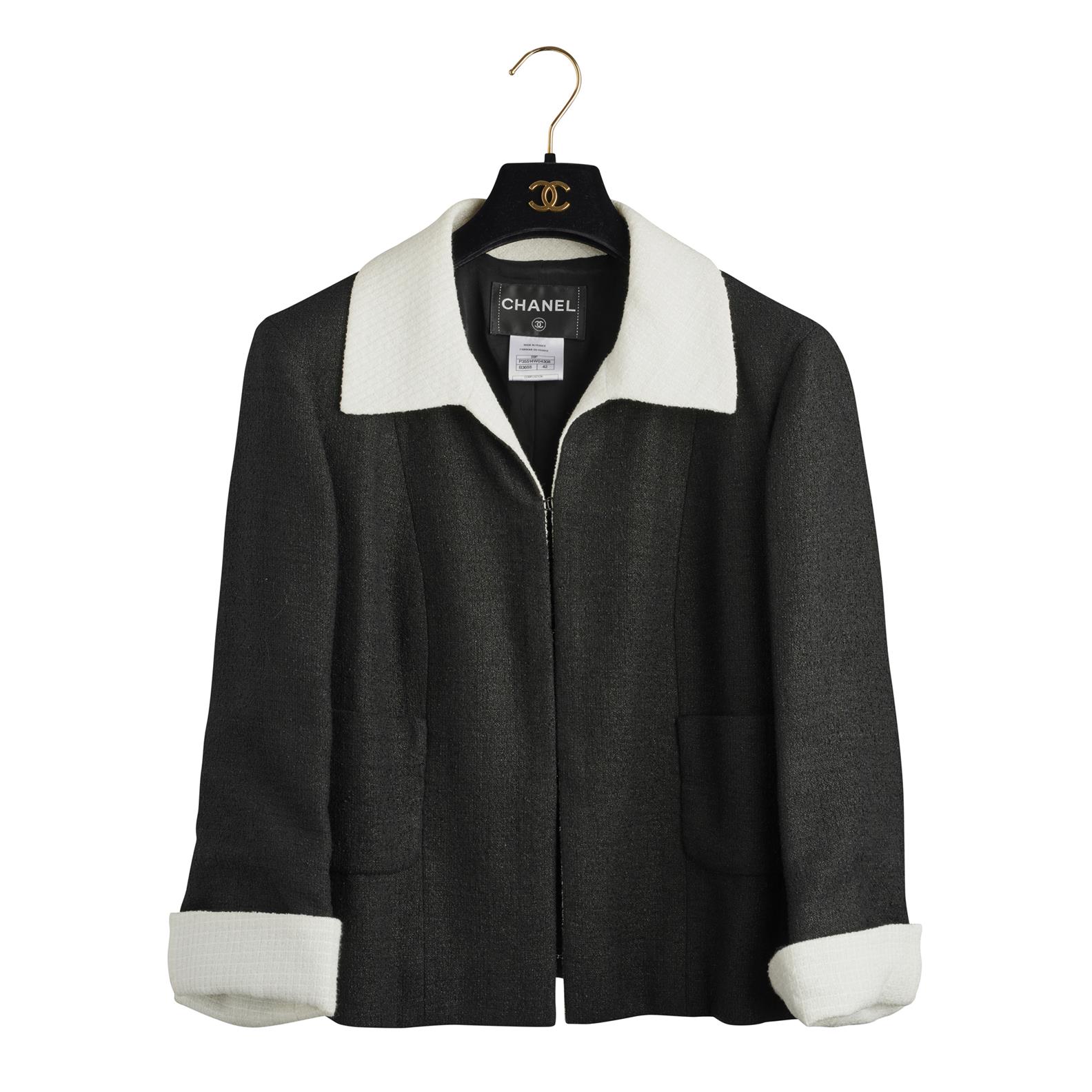CHANEL, A TWEED JACKET STYLED IN TWEED LINEN, COTTON, WOOL BLEND WITH CONTRAST WHITE COLLAR AND TURNED UP CUFFS, MARKED SIZE 42.