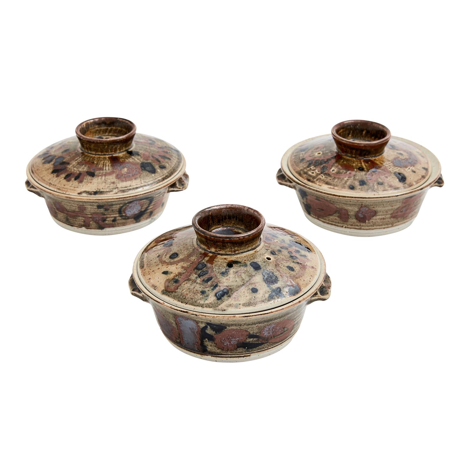 JOHN OLSEN: THREE STONEWARE COVERED BOWLS