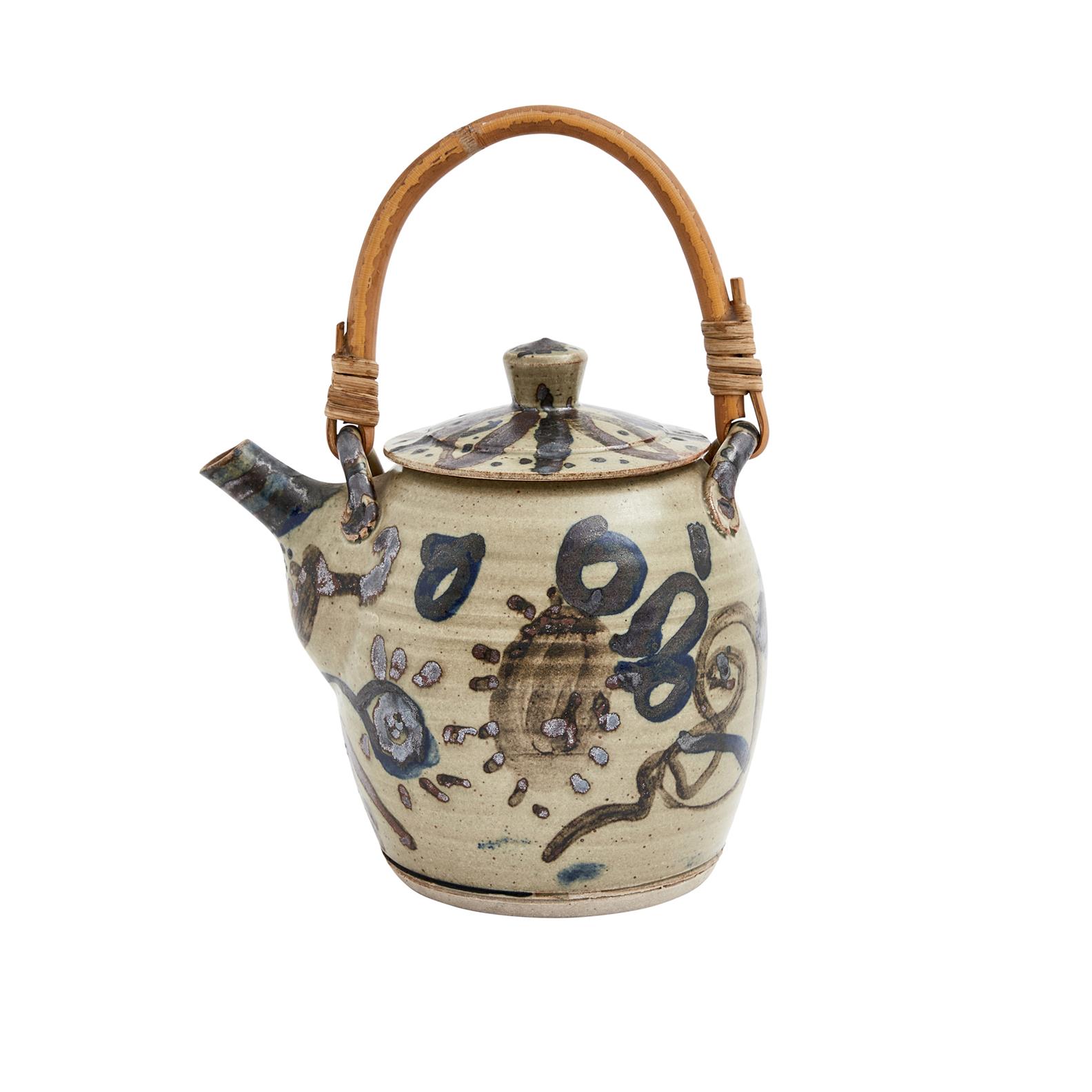Potted by Robert Mair, decorated in shades of blue, brown and silver lustre with typical calligraphic designs, bamboo loop handle, the base with impressed potter's mark and inscribed 'the joy of the bursting seed' / John Olsen / 71.