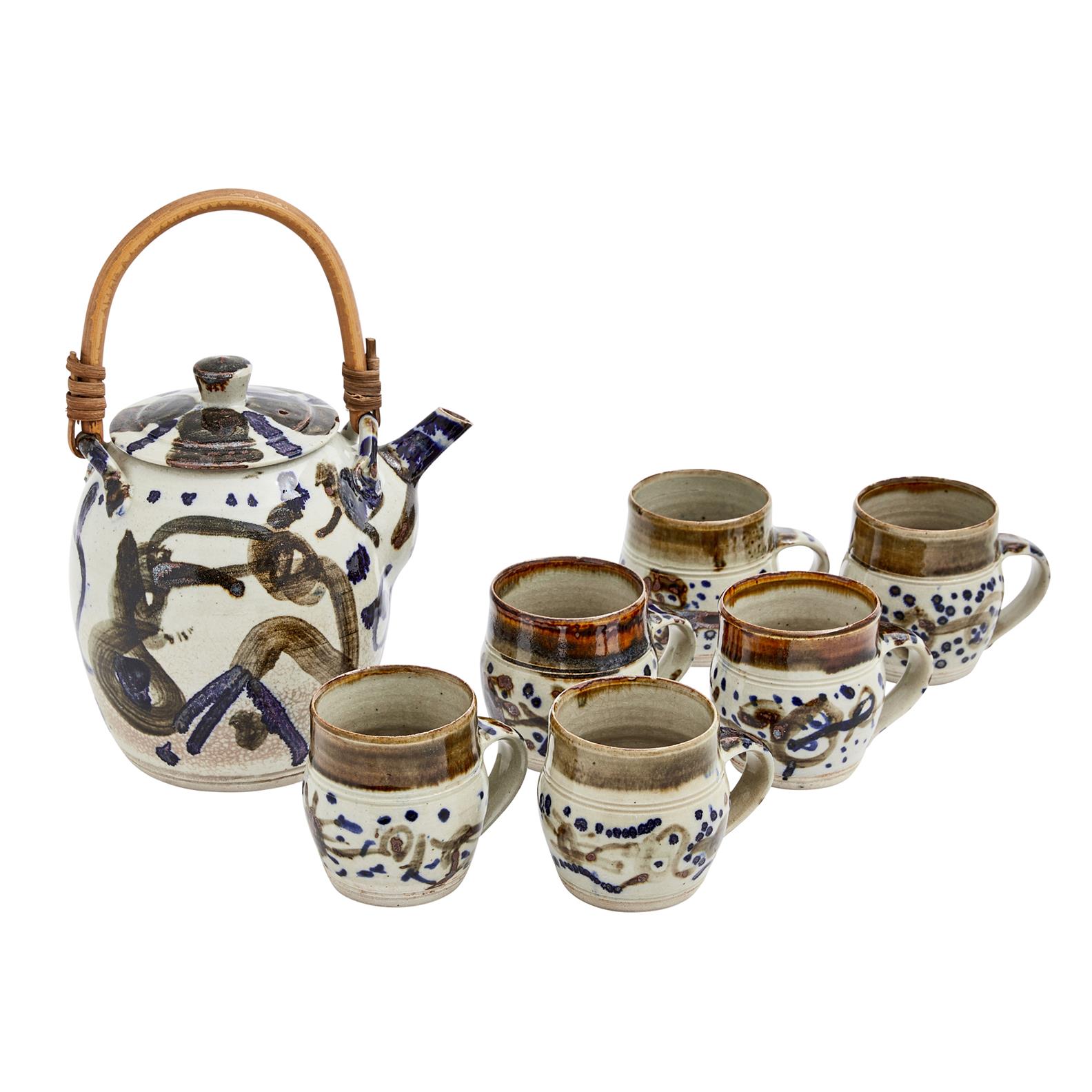 JOHN OLSEN: A STONEWARE TEAPOT AND SIX MUGS