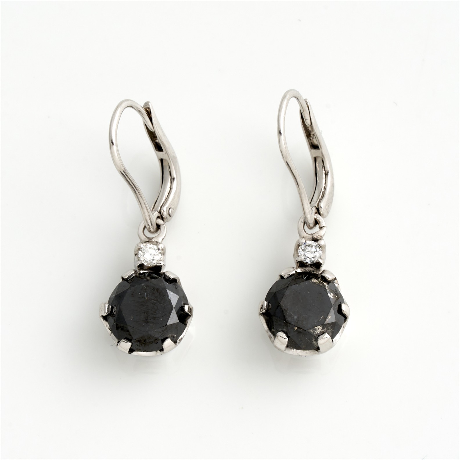 A PAIR OF DIAMOND AND BLACK DIAMOND EARRINGS TO HOOK AND CLIP FITTINGS IN 18CT WHITE GOLD, THE DIAMONDS TOTALLING 4.34CTS, 25MM, 3.91GMS