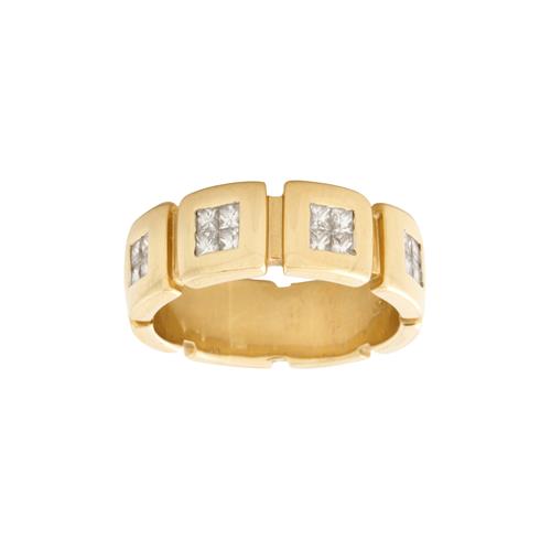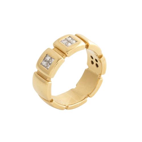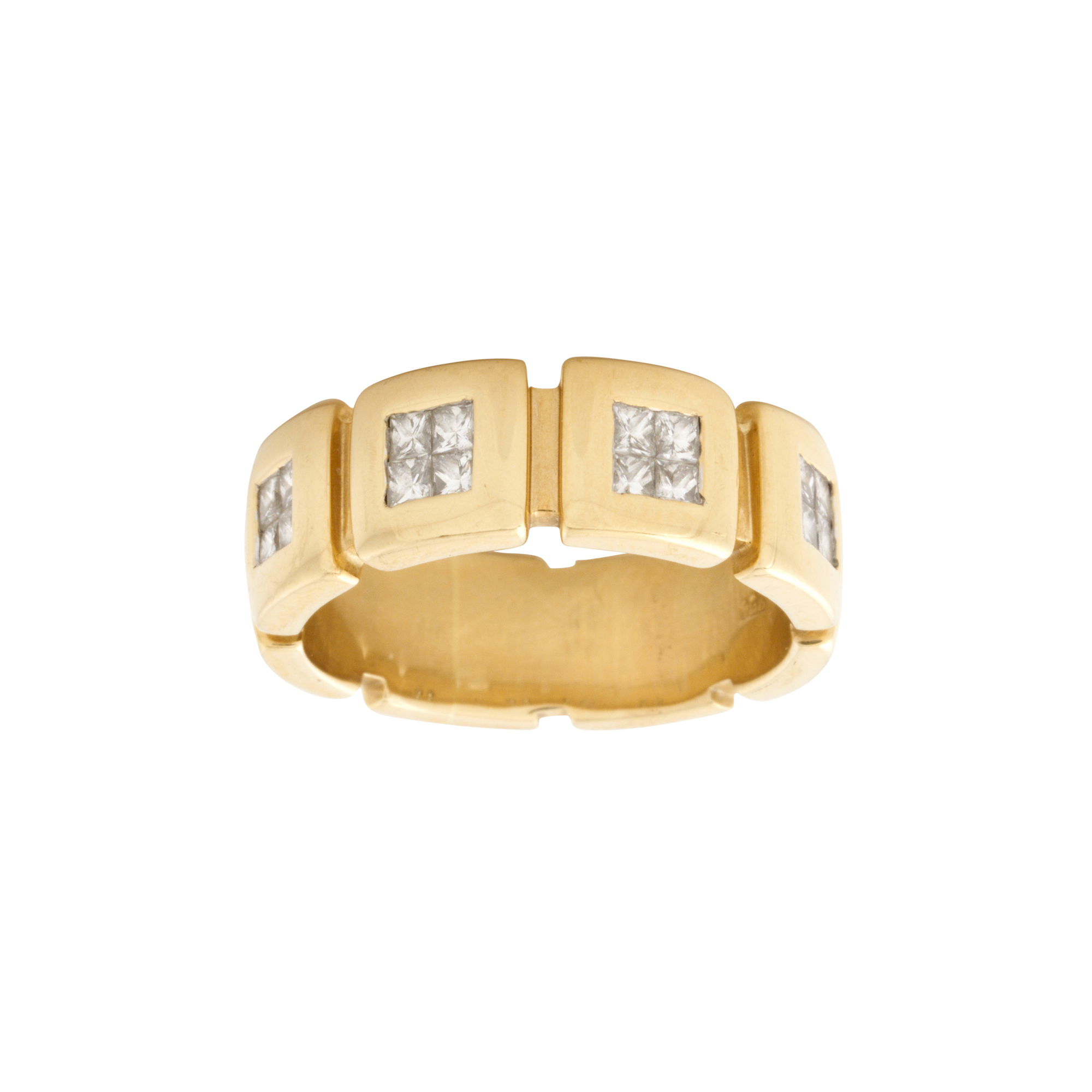 Styled as a full circle of geometric panels, the top four panels centring a cluster of invisible-set princess-cut diamonds, the diamonds together weighing approximately 0.80 carats size Q, gross weight approximately 10.2 grams.