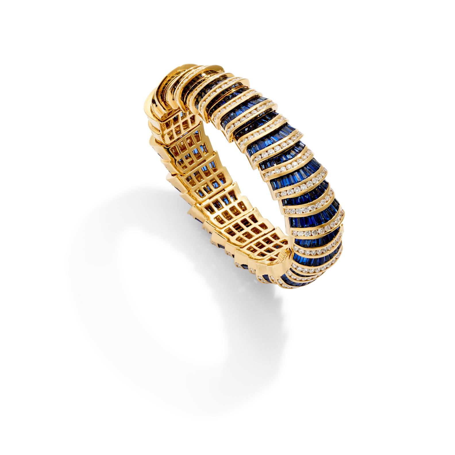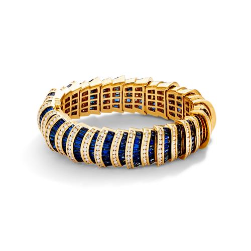 Composed of an articulated line of fan shaped links channel set with a line of brillaint-cut diamonds between custom cut sapphires, the sapphires and diamonds together weighing approximately 53.74 carats and 10.00 carats respectively, mounted in 18ct gold, inner circumference 179mm, gross weight 140.00 grams, signed Krypell.