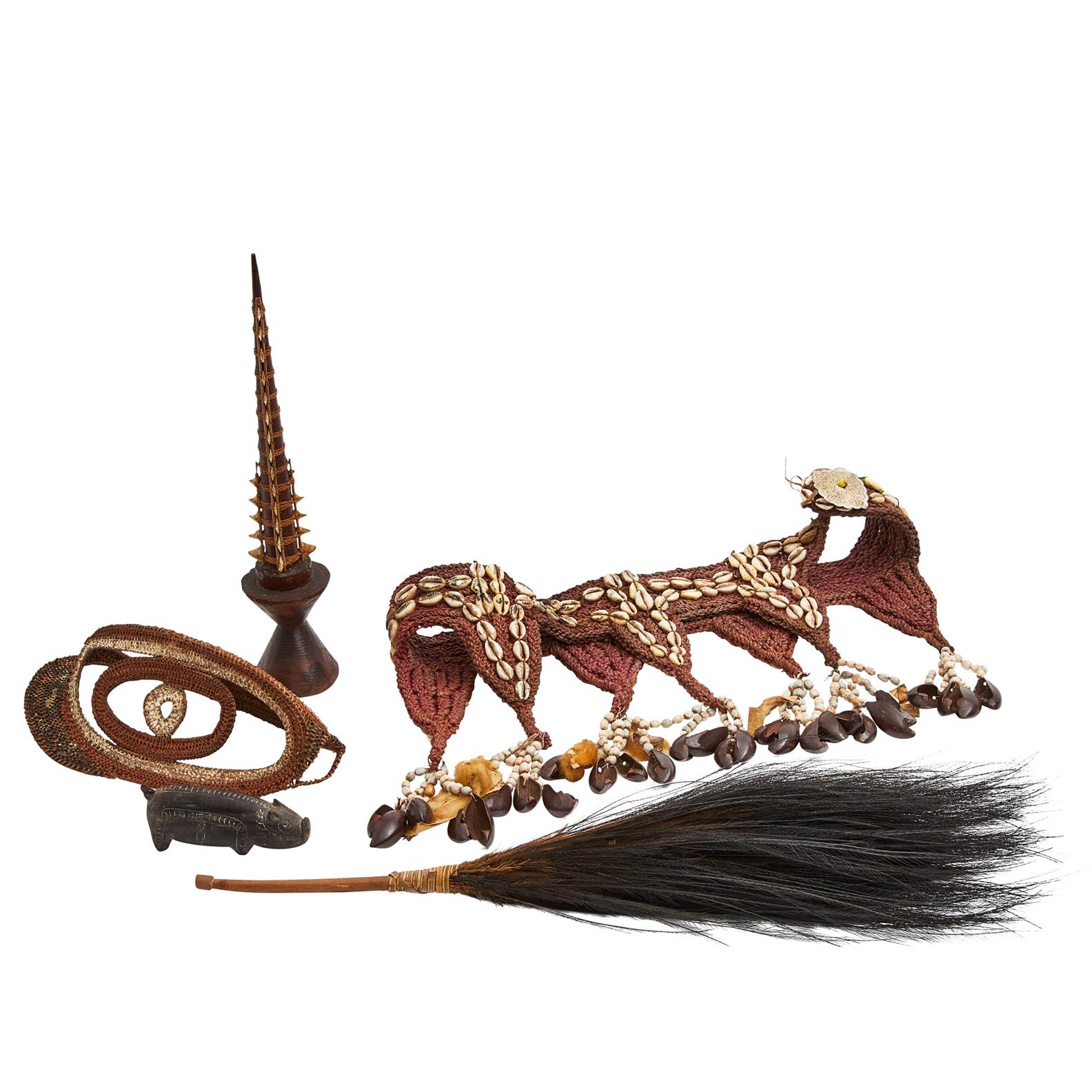 Papua New Guinea, comprising a feather fly whisk, a carved pig, a Gilbert Islands shark tooth spearhead, a woven mask, and a cowrie shell woven fibre belt. (5)