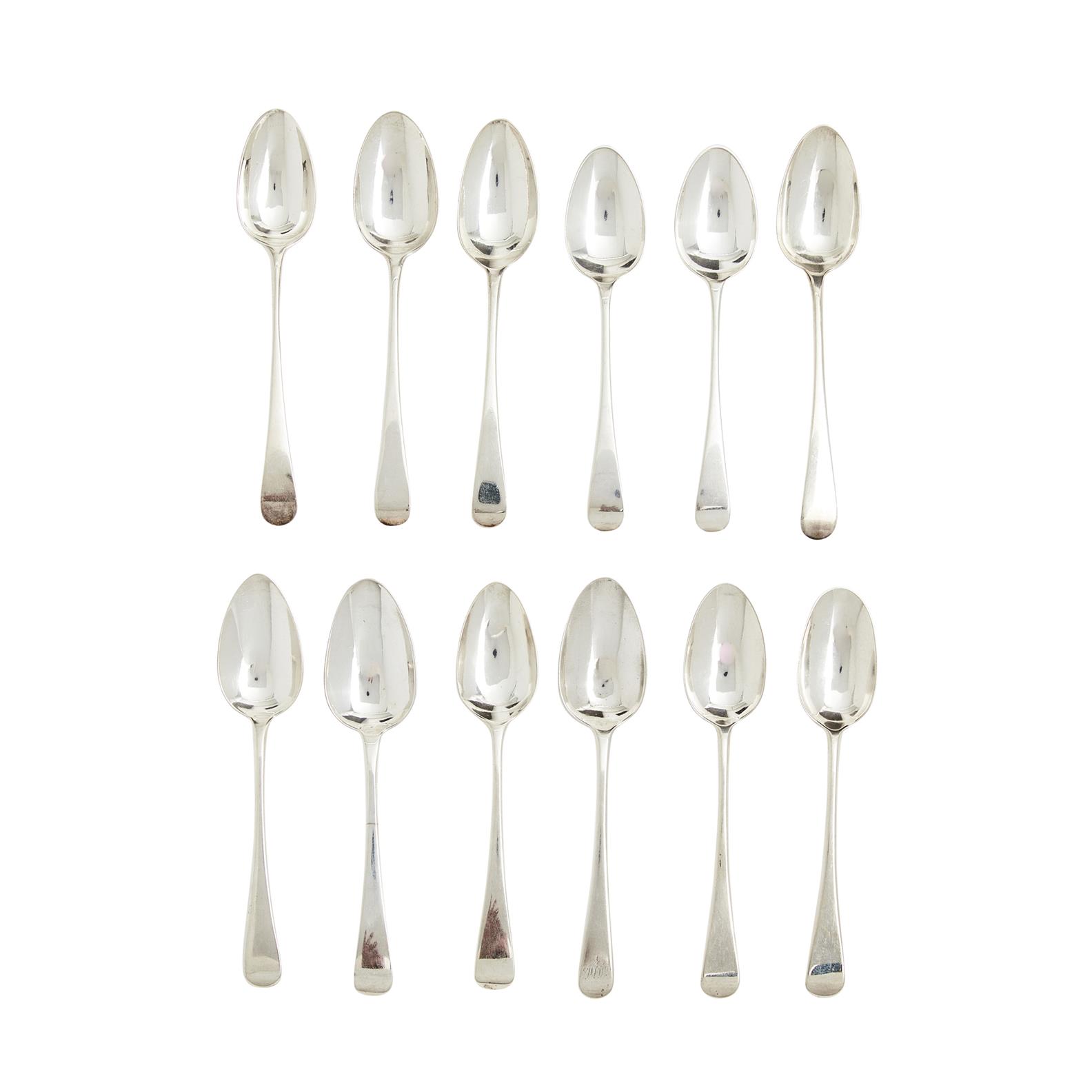 TWELVE GEORGIAN SILVER OLD ENGLISH PATTERN DESSERT SPOONS