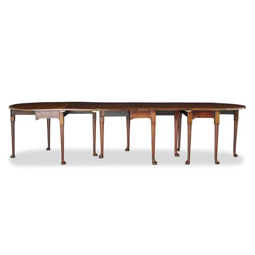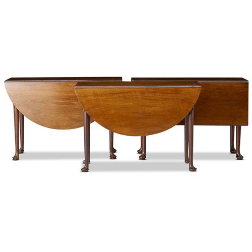 In three sections, the two end sections each with a single semicircular drop-leaf, the central section with a drop-leaf each side, together with a further spare leaf, raised on turned supports with pad feet