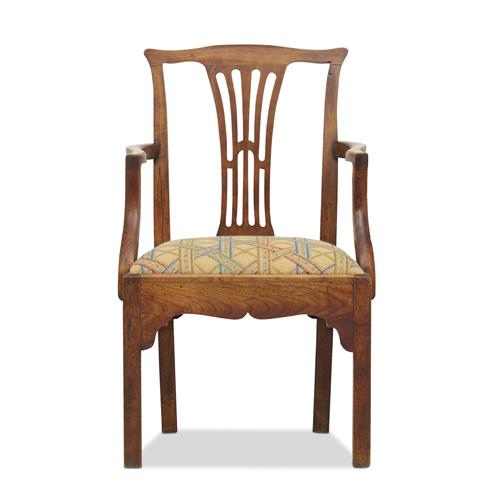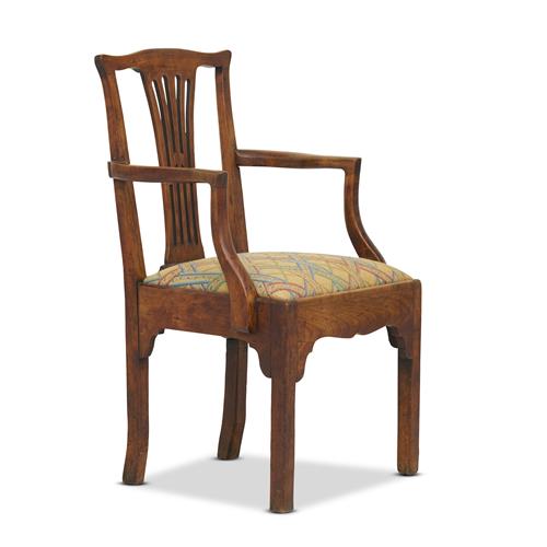 The open back with lightly shaped toprail and pierced vasiform splat above the curving arms and drop-in seat in needlework fabric, on square supports with shaped seat rails