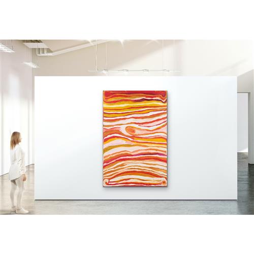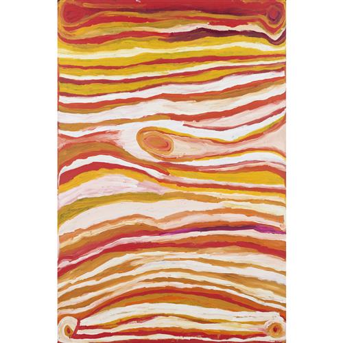 "This work reflects a classic depiction of the Great Sandy Desert around the mid-section of the Great Sandy Desert. This is Nora's traditional country where she grew up as a girl and continued to live until she moved with family to Billiluna and then to Balgo. The painting shows a landscape rich in sandhills (tali) as seen in the parallel lines. The colour variation shows varying bushfoods such as bush onion, bush tomato and bush raisin."