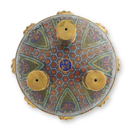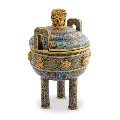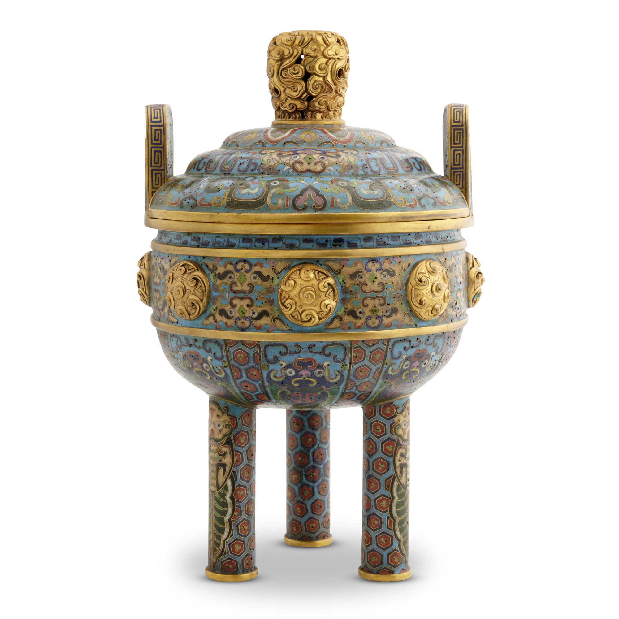 A CHINESE CLOISONNE TRIPOD CENSER AND COVER, DING, QIANLONG MARK, QING DYNASTY (1644 - 1911)