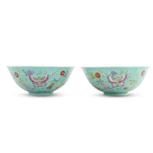 A PAIR OF CHINESE TURQUOISE GROUND FAMILLE-ROSE BOWLS, GUANGXU SIX-CHARACTER IRON RED MARK AND OF THE PERIOD (1875 - 1908)
