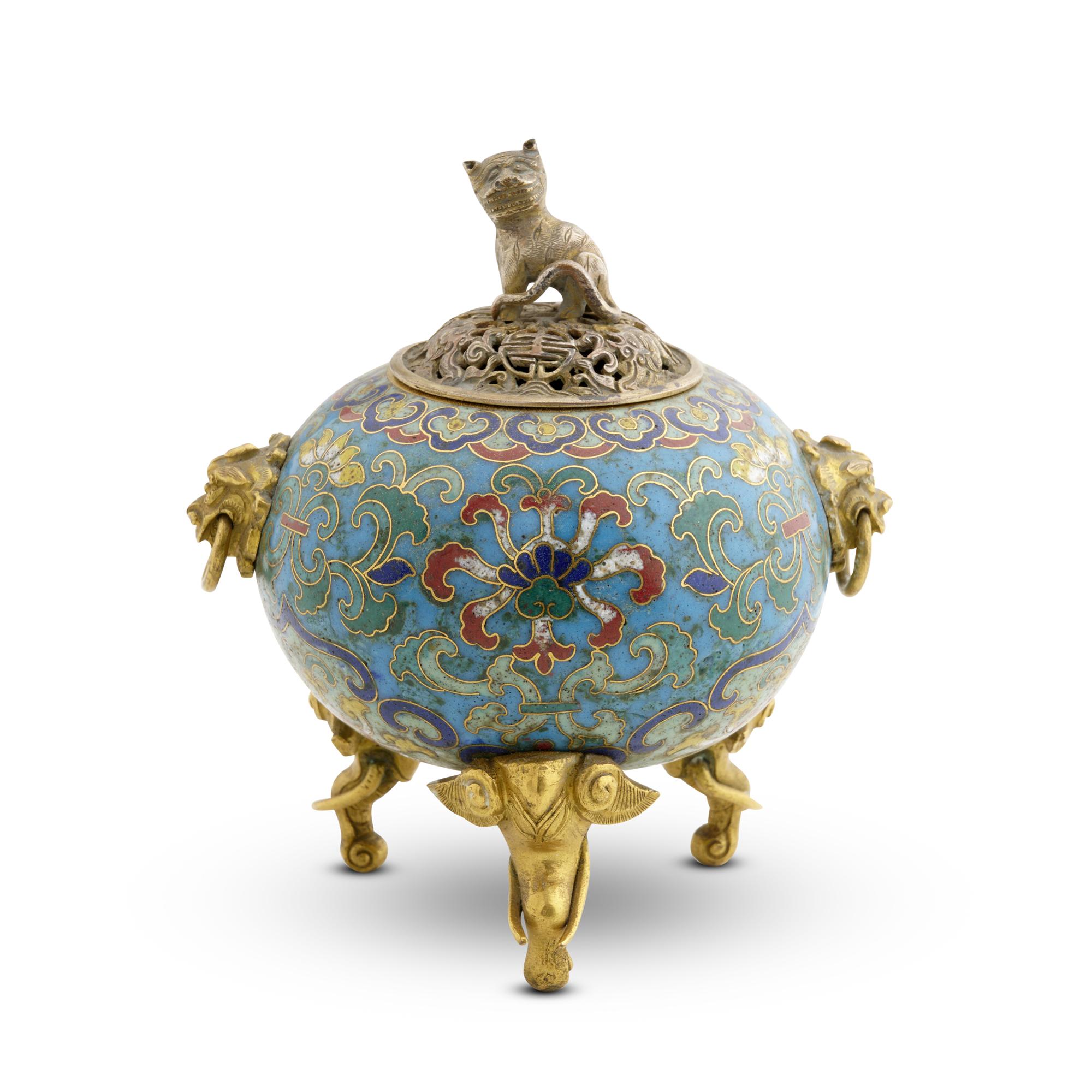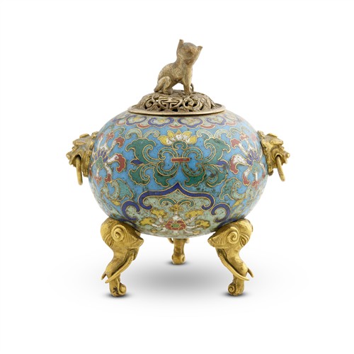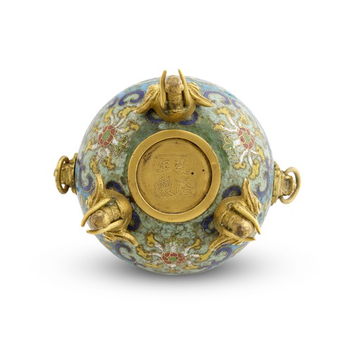 A CHINESE CLOISONNE ELEPHANT FEET TRIPOD CENSER, QIANLONG MARK, QING DYNASTY (1644 - 1911)