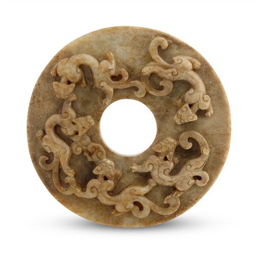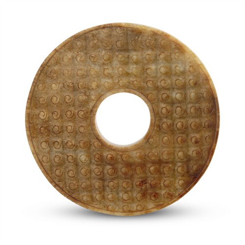A CHINESE ARCHAISTIC CARVED MOTTLED JADE DISC BI, MING DYNASTY (1368 - 1644)
