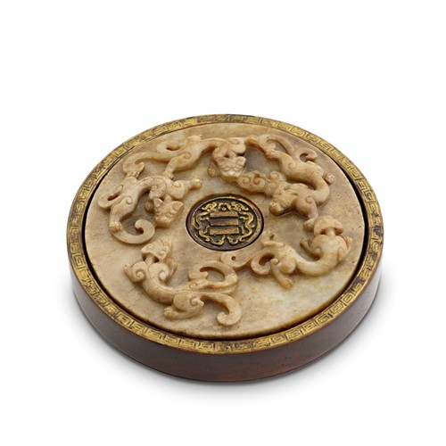 The front of the disc is carved with four chilong dragons, one of which is holding lingzhi sprays in its mouths. The reverse is carved with a dense pattern of raised bosses in the archaistic style. The mottled stone ranges from pale celadon to dark brown tones. It's mounted on a wooden stand, with a gilded key-fret border along the rim. At the centre, framed by a pair of kui dragons, is the classic "Three" character mark. In the I Ching, the number three corresponds to the "Qian" trigram; combined with the surrounding dragons, it forms an allusion to "Qianlong" subtly reinforcing the emperor' s authority while showcasing the ingenuity and skill of the craftsman.