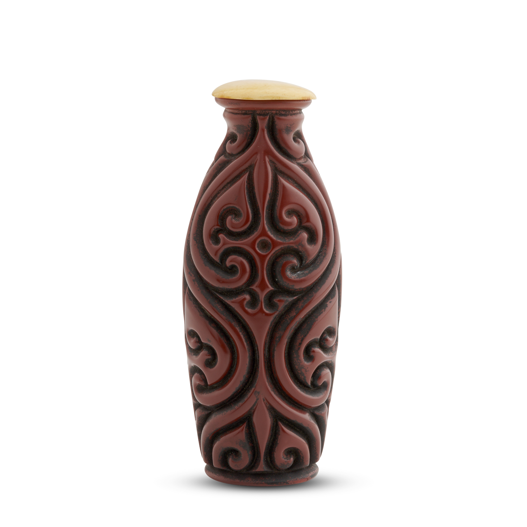 瓶身層層雕刻漩渦紋,漆色深紅,工藝繁複。配舊象牙蓋及盒。