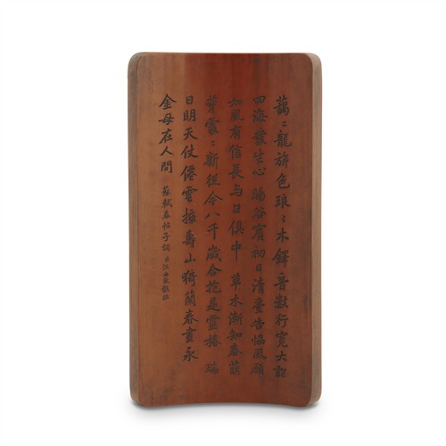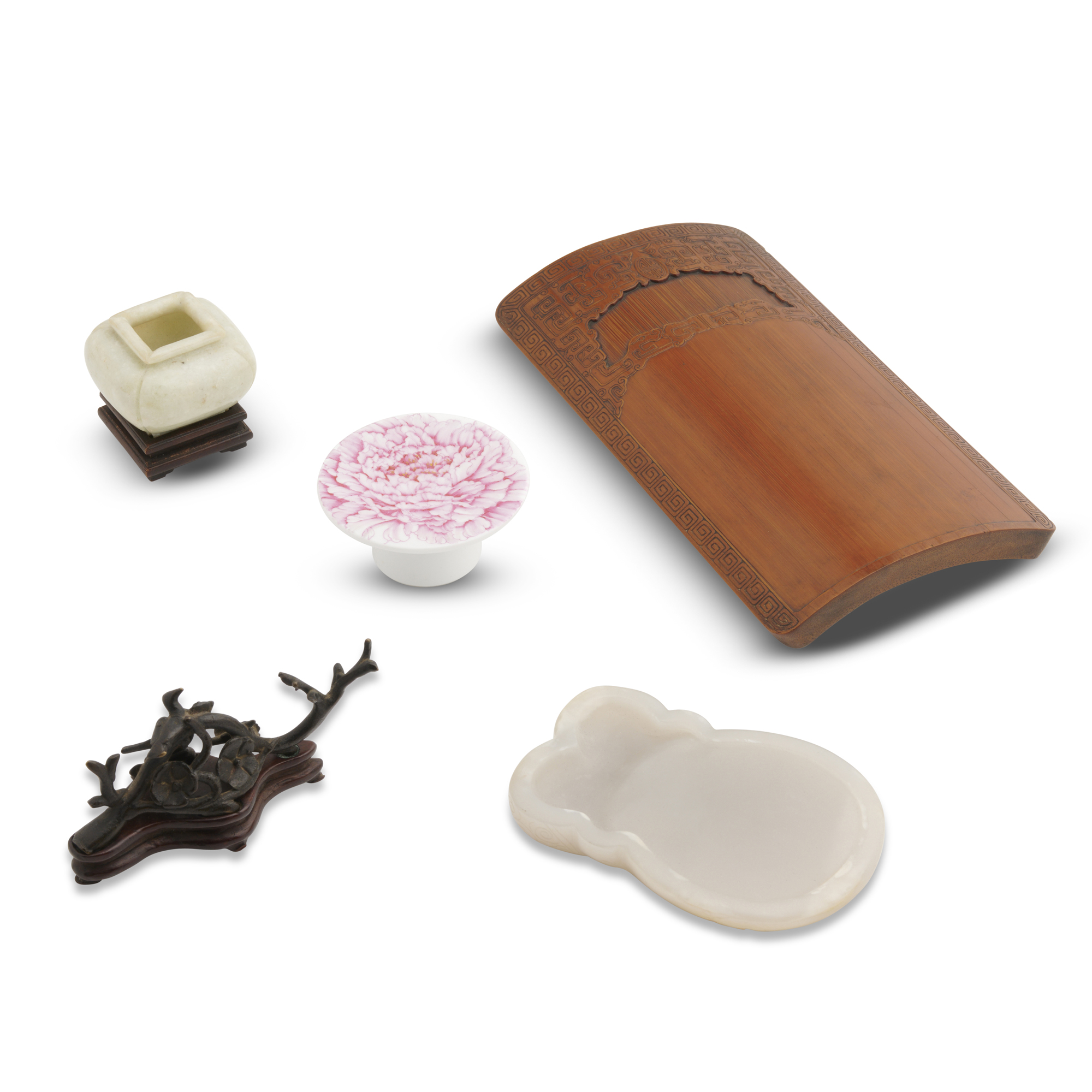 Comprising a bamboo carved arm rest, Wang Youdun mark, Qing dynasty; a jade carved ink stone, Qing dynasty, a jade carved square washer, Qing dynasty, a famille-rose ink stand and a bronze brush stand, Ming/Qing dynasty, 17th century.