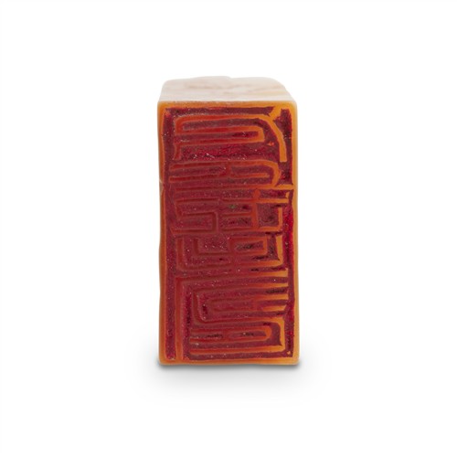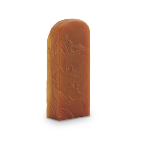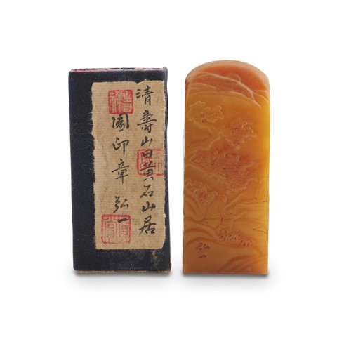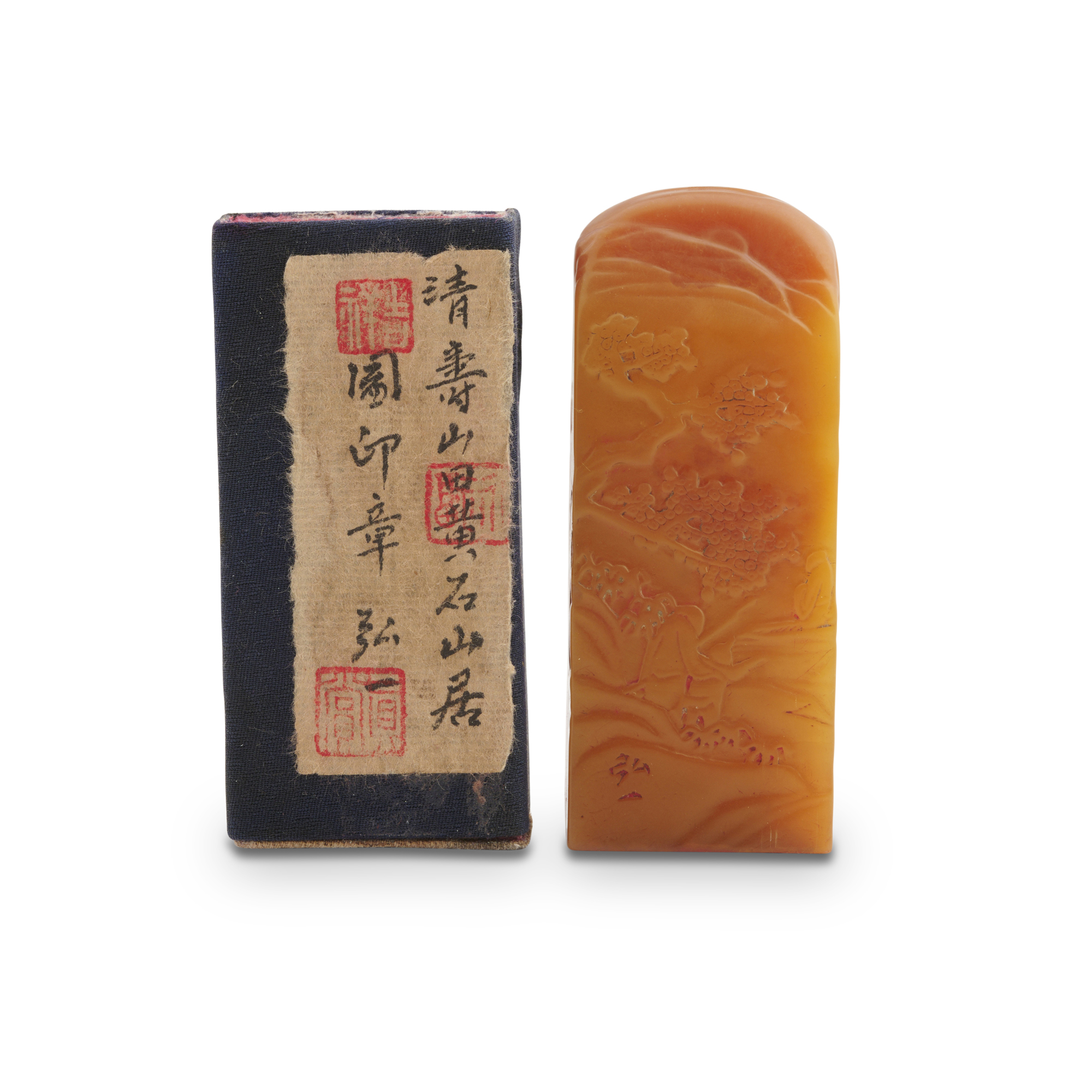 外壁淺浮雕山水人物,正面左下刻「弘一」款。印面刻「人長壽」四字,寓意延年益壽。