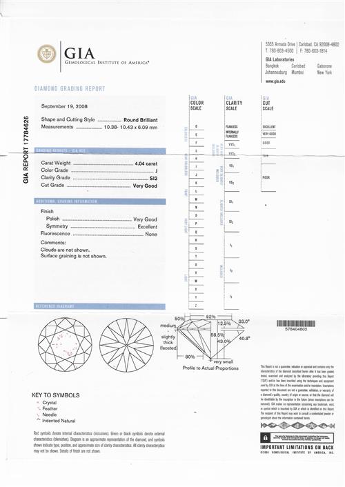 Accommpanied by a GIA report numbered 17784626, dated 19 September 2008, stating that the 4.04 carat diamond is natural, J colour, SI2 clarity.