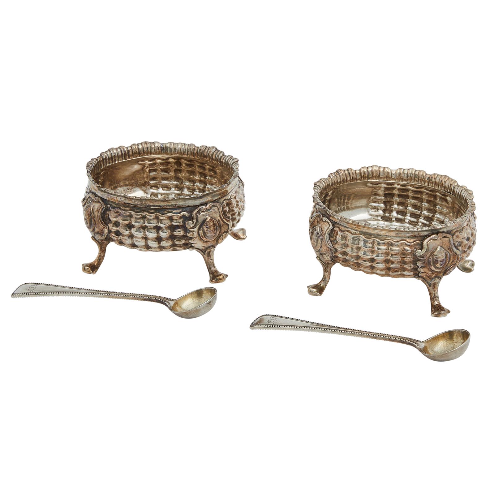 Maker's mark of David and Robert Hennell I, London 1771, each shaped oval with overall auricular design on four swept legs with cartouche headers, and a pair of associated Victorian silver salt spoons.