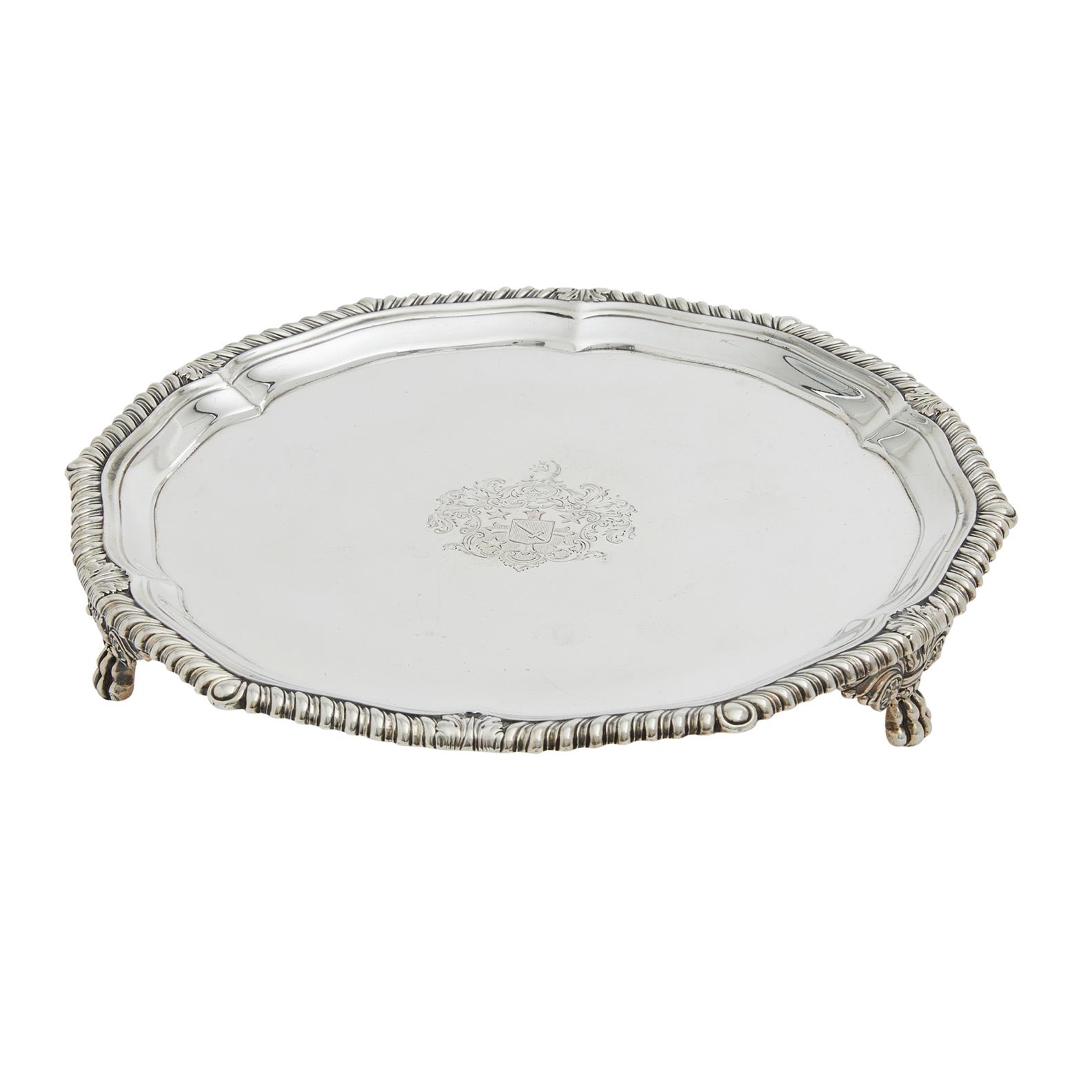 Maker's mark of Paul Storr, London 1809, shaped circular with gadrooned and leaf cast border on three leaf cast anthemion scrolled lion paw feet, engraved with a coat of arms.
