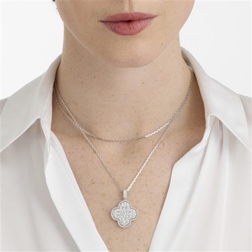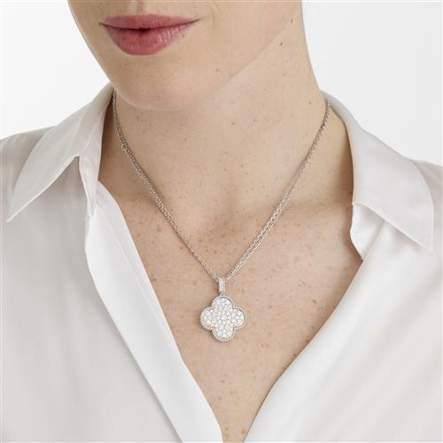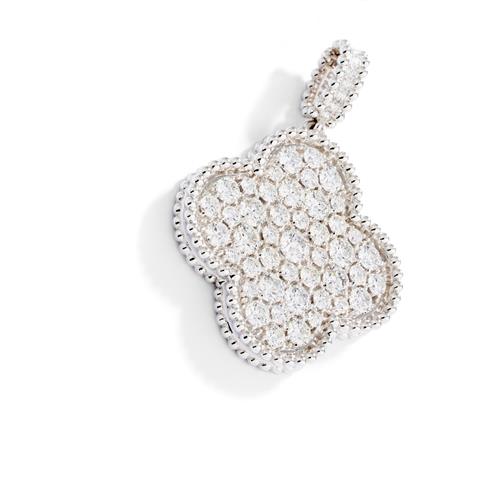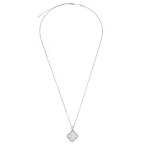 Terminating on a clover leaf motif pavé-set with 45 brilliant cut diamonds supported from a fine trace chain, the diamonds together weighing approximately 2.44 carats, mounted in 18ct white gold, chain length 900mm, pendant length 36mm, width 26mm, signed VCA for Van Cleef & Arpels.