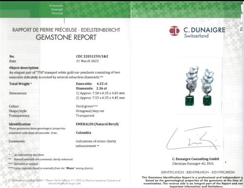 Accompanied by a C. Dunaigre report numbered CDC22031259/1&2, dated 31 March 2022, stating that the 4.25 carat Emeralds are natural, vivid green colour, typically found in emeralds from the "Muzo" mining district, of Colombian origin, with indications of minor clarity enhancement.