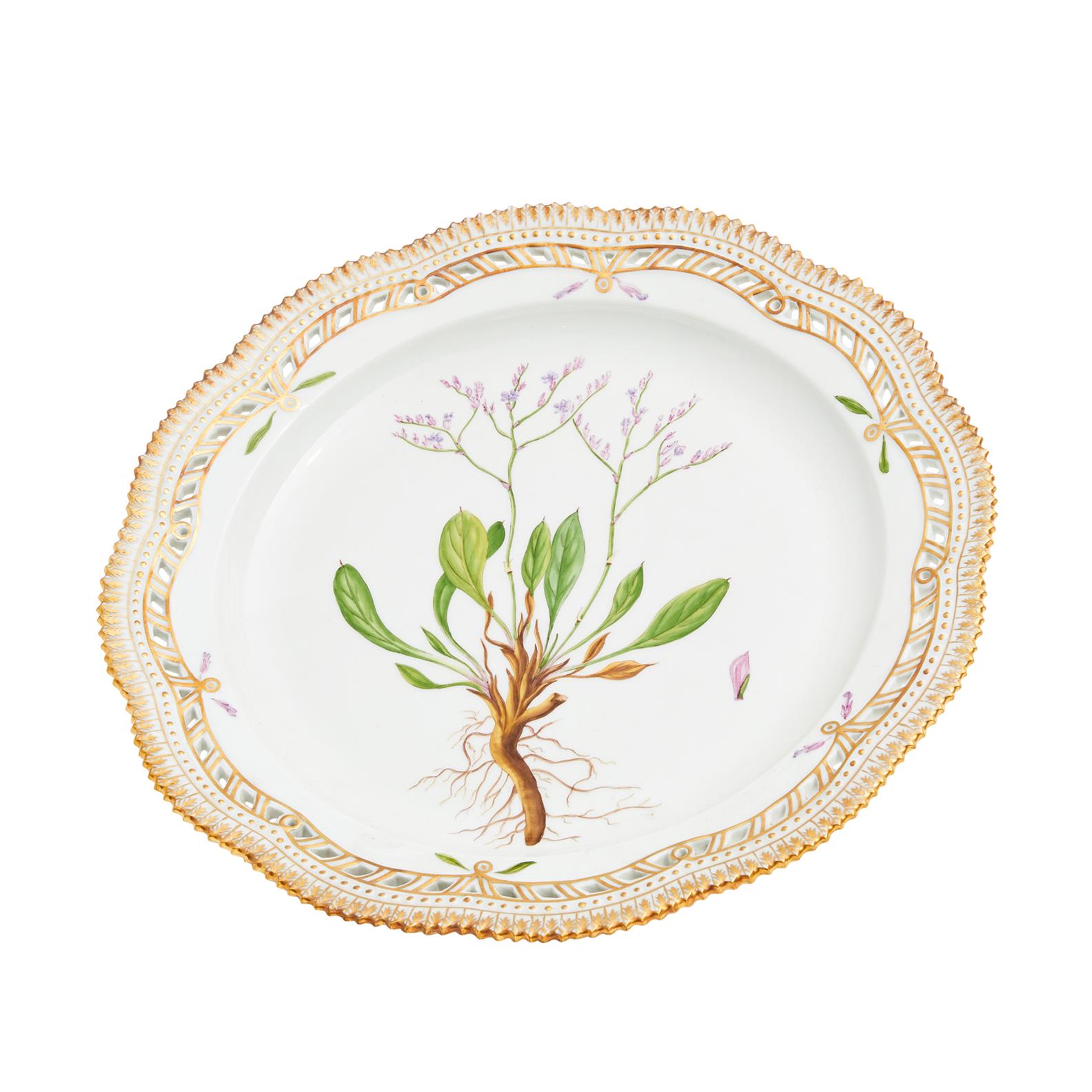 20th century with pierced, gilt and moulded borders, painted with "Statice rariflora Drei" Pattern number 20, shape 3528.