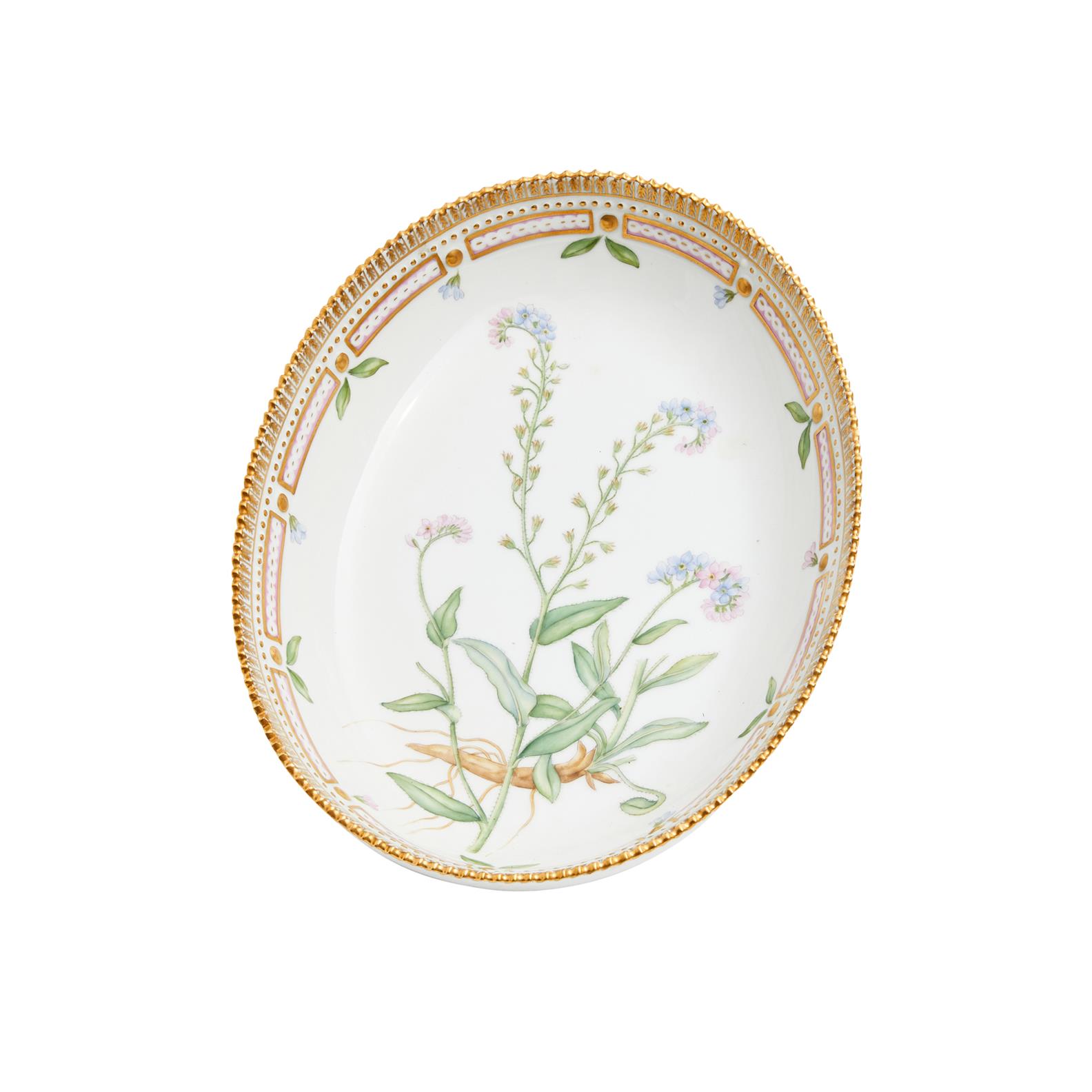 20th century with gilt and moulded borders, painted with "Myosotis scordioides Oed." Pattern number 2, shape 3506.