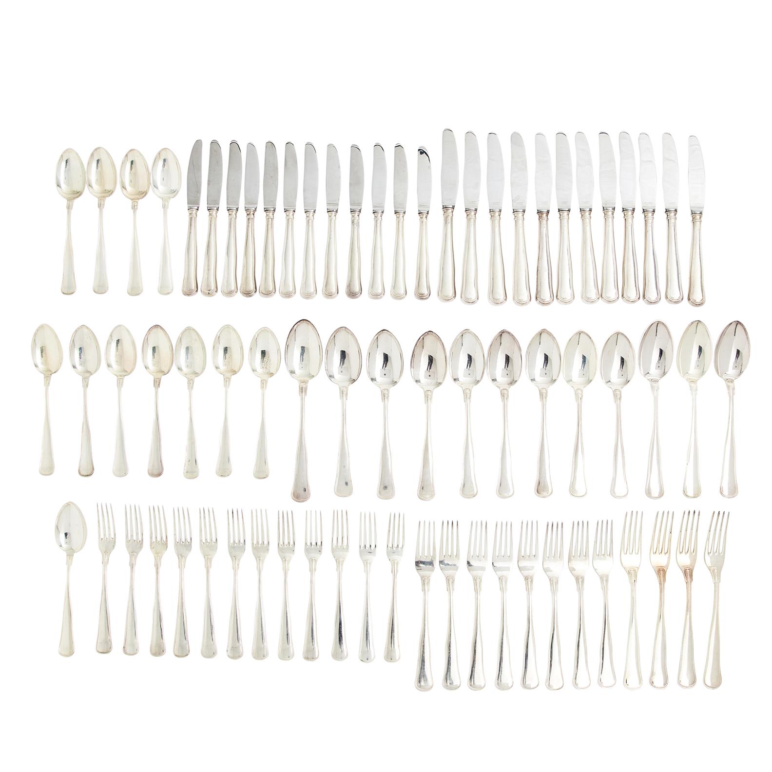 20th century, maker's mark of W & S Sorensen, comprising 12 table knives, 12 entree knives, 12 table forks (four slightly larger), 12 entree forks, 12 tablespoons (four slightly larger), and 12 dessert spoons. (72)