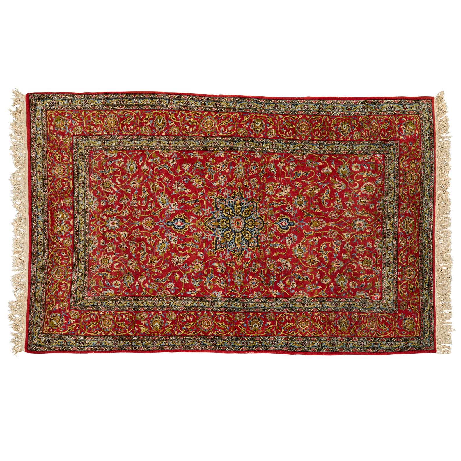 The central blue lobate medallion on a blood-red ground with all over shah abbas flowers and tendrils, within a conforming border within triple borders.