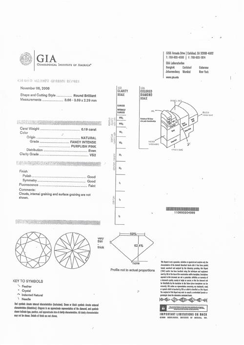 Accompanied by a facsimile GIA report numbered 1106340392, dated November 06, 2008, stating that the 0.19 carat diamond is natural, Fancy Intense Purplish-Pink colour, VS2 clarity;