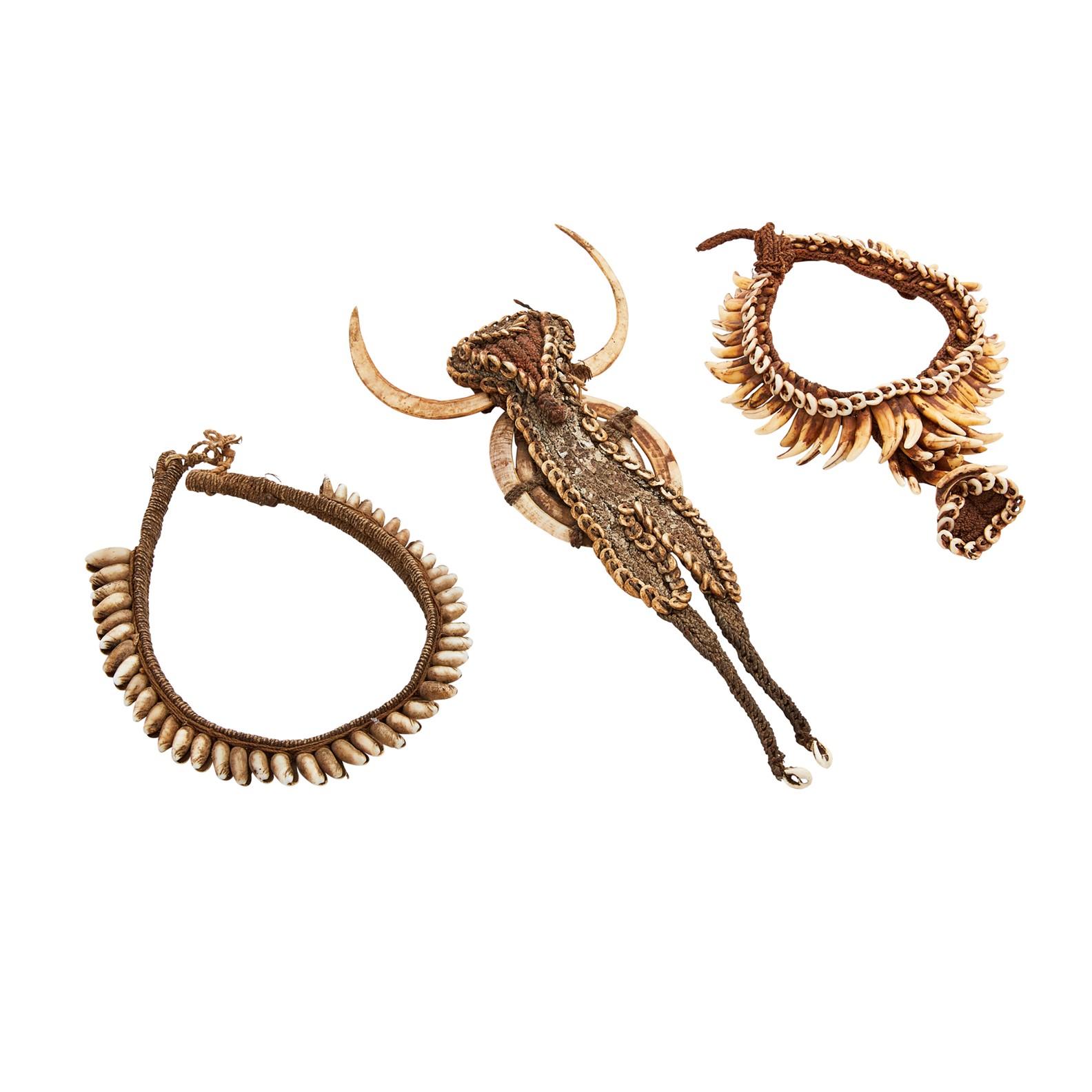 Including a Highland New Guinea War Charm of anthropomorphic form, a shell necklet and another with dogs teeth (3).