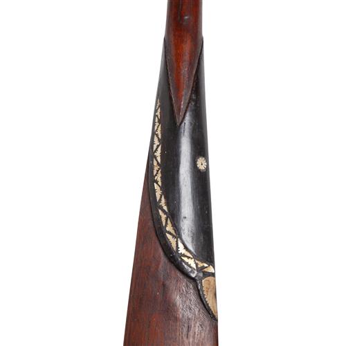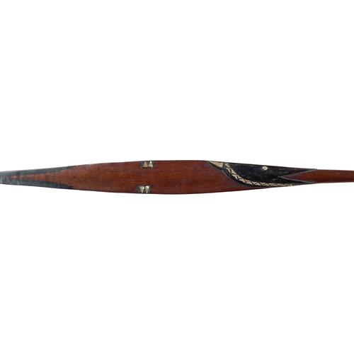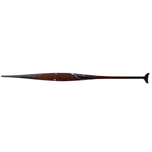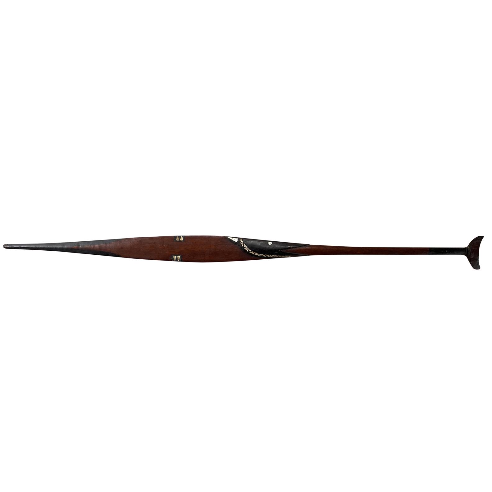 In the form of a fish with the blade of the paddle issuing from the mouth of the fish, golden nautilus shell inlay and with a fine patina.